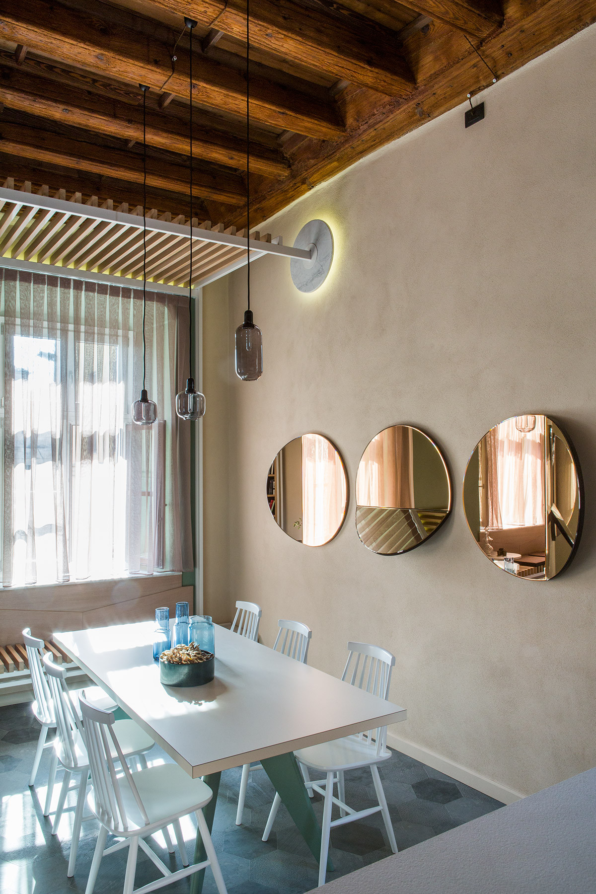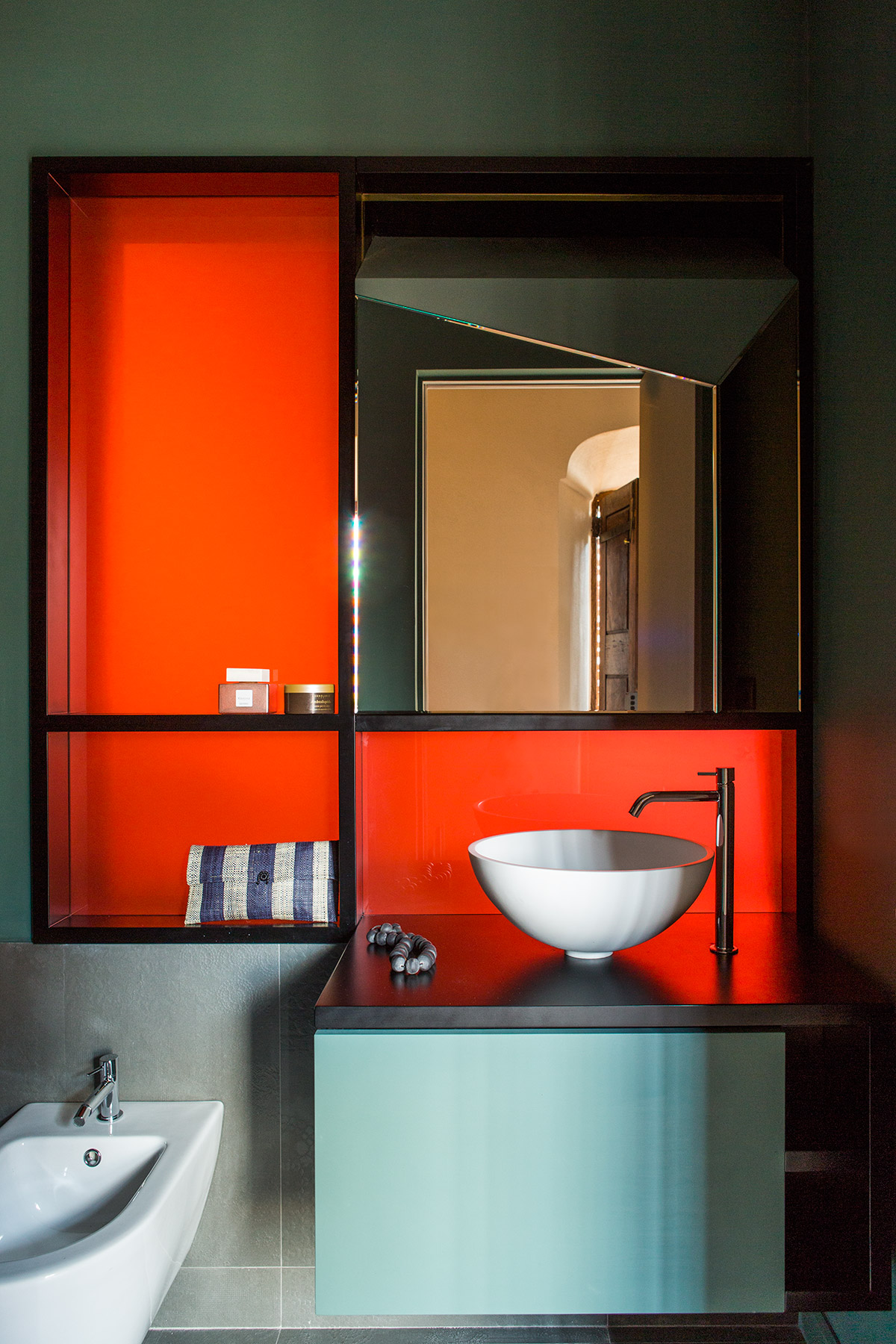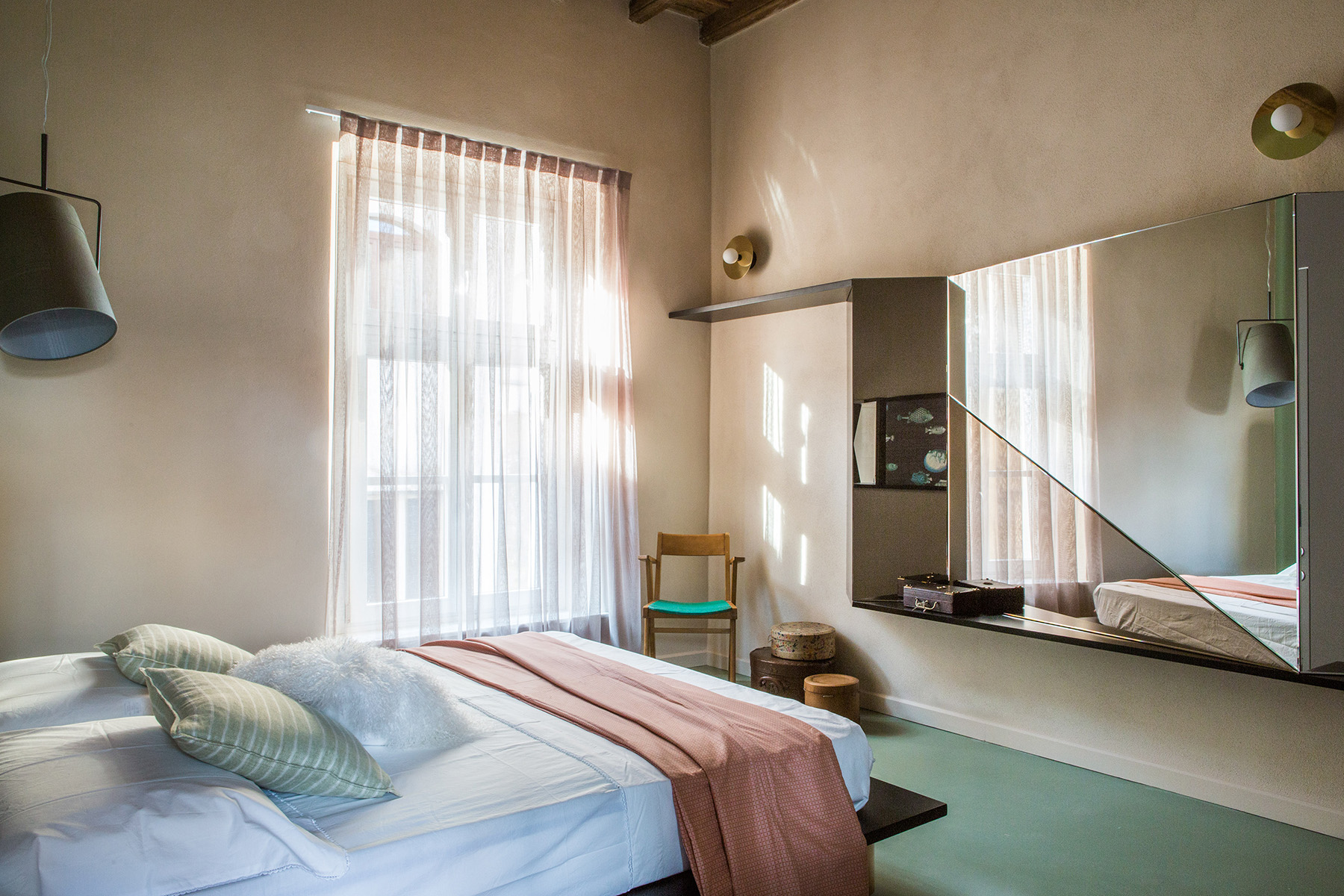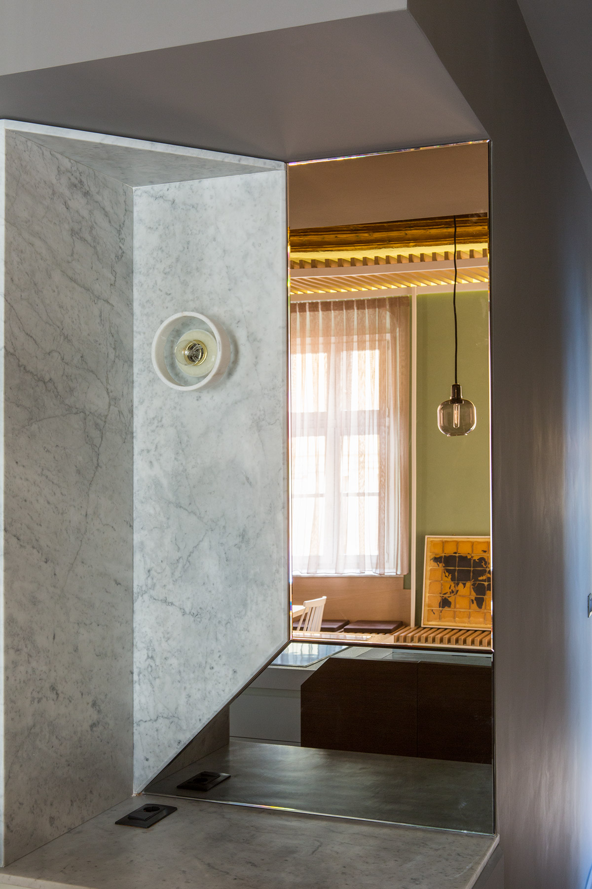 Materiali preziosi danno valore al tempo che passa e caratterizzano l’intervento. Rivestimenti di marmo Carrara nella cucina, rame per il basamento del letto e pelle vintage sulla testiera, ottone nel bagno padronale che si ossida con l’umidità e invecchia insieme alla torre. Specchi in tutti gli ambienti riflettono non solo la vista e la luce, ma anche la bellezza della casa, i suoi anni, i suoi soffitti a cassettoni e i suoi muri ruvidi, spessi e storti. Specchi di diverse forme e misure, irregolari e colorati propongono visuali inaspettate.