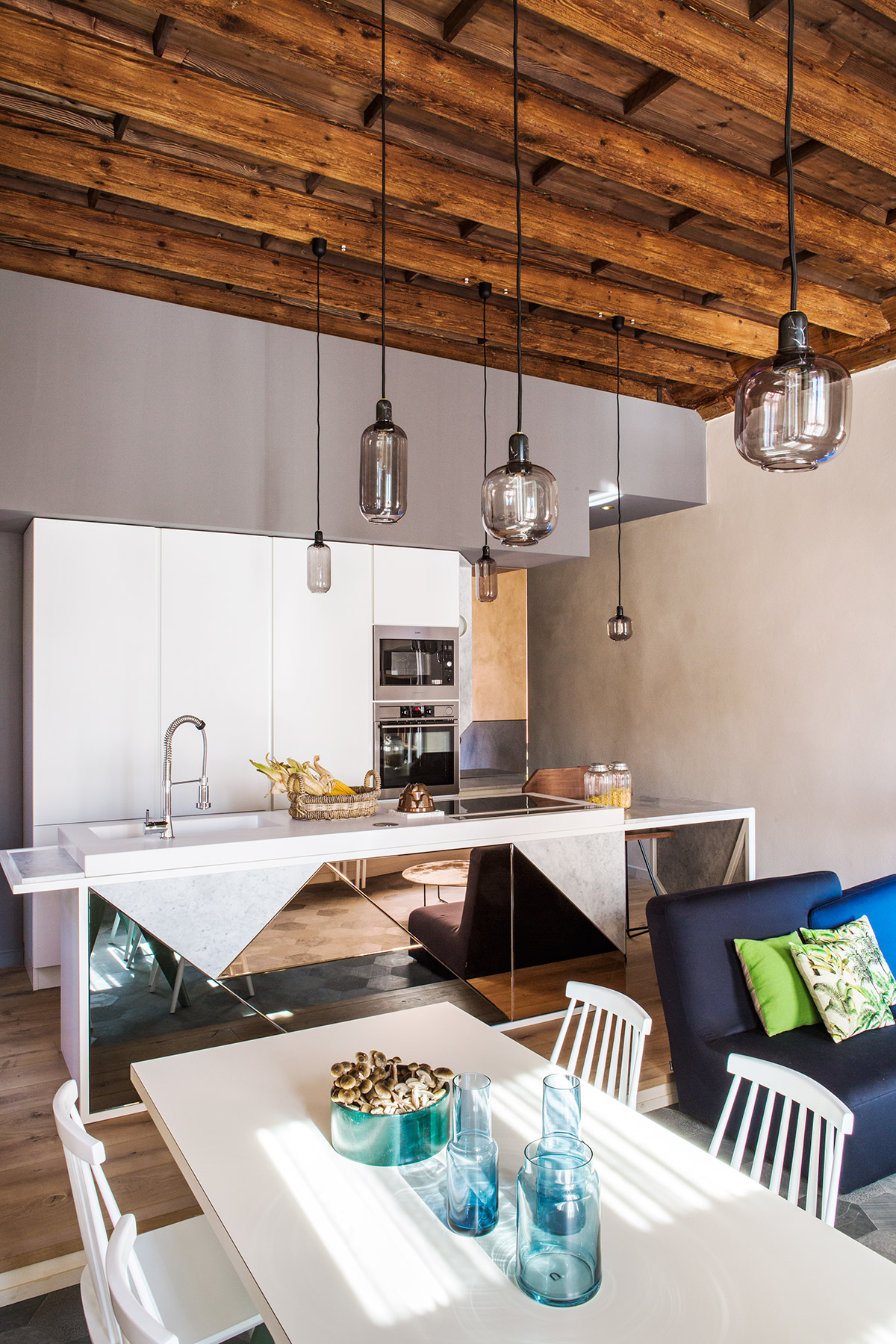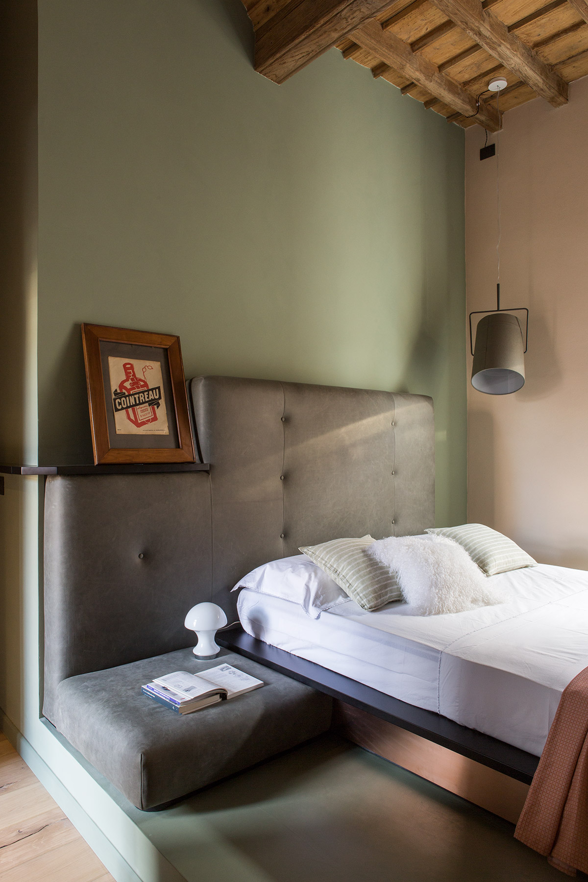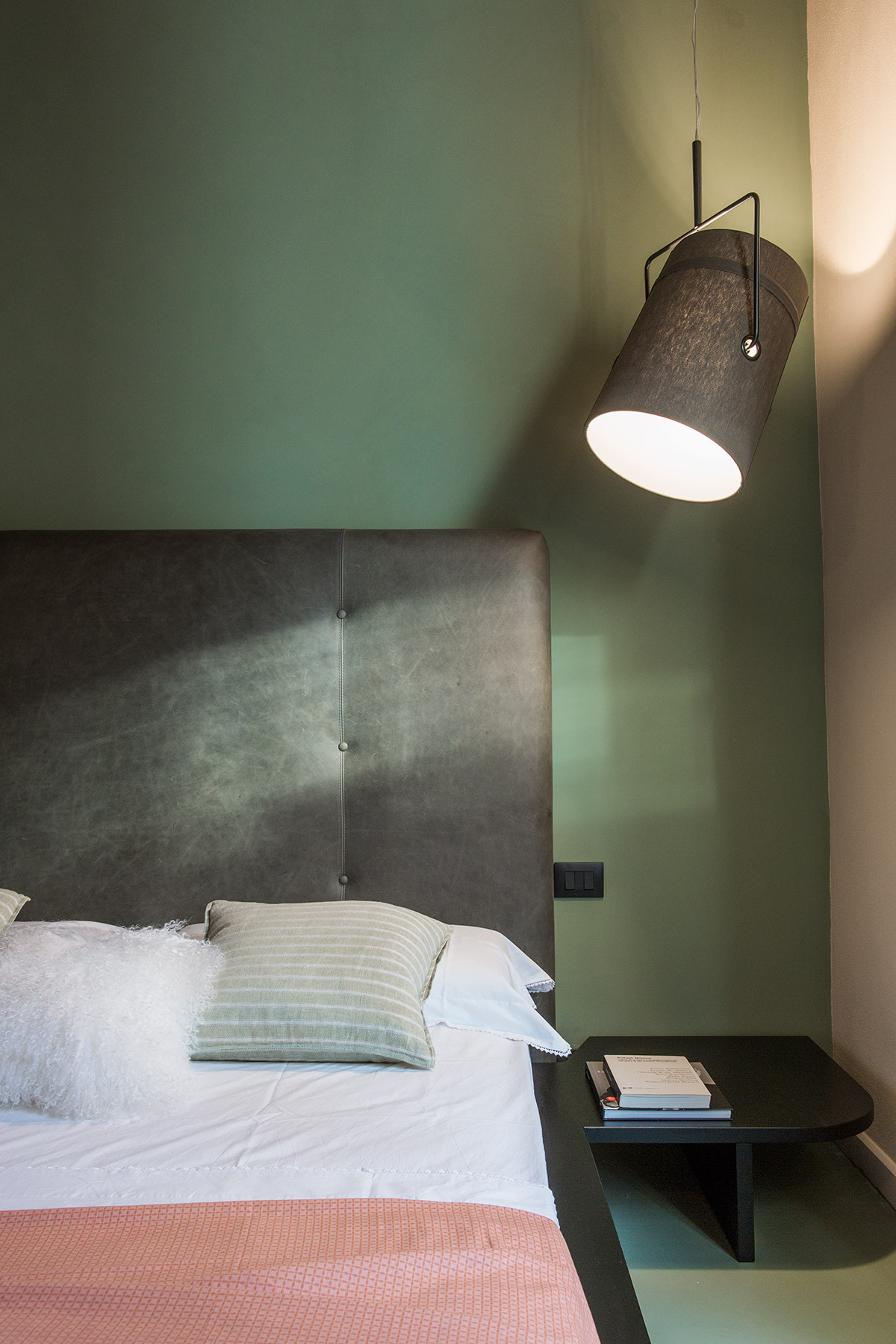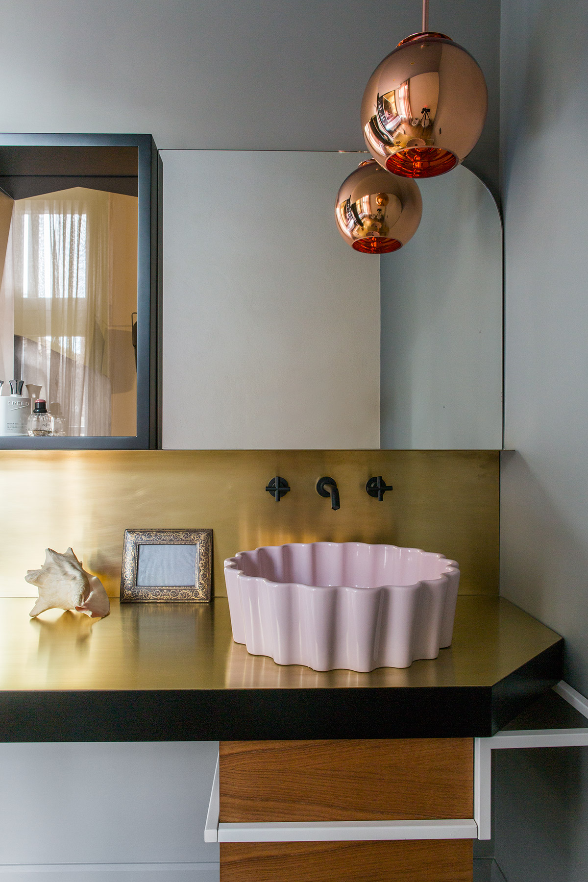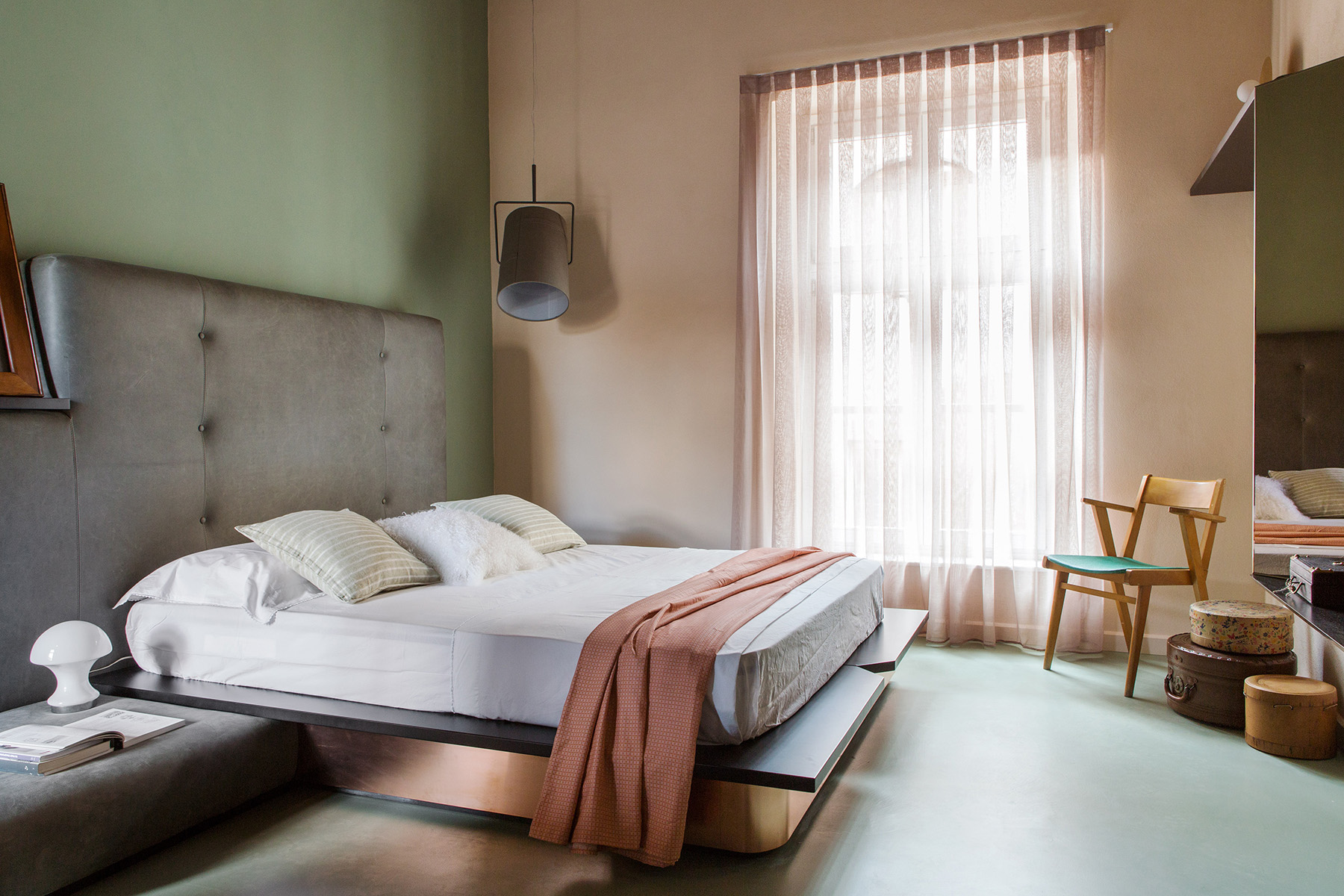 Materiali preziosi danno valore al tempo che passa e caratterizzano l’intervento. Rivestimenti di marmo Carrara nella cucina, rame per il basamento del letto e pelle vintage sulla testiera, ottone nel bagno padronale che si ossida con l’umidità e invecchia insieme alla torre. Specchi in tutti gli ambienti riflettono non solo la vista e la luce, ma anche la bellezza della casa, i suoi anni, i suoi soffitti a cassettoni e i suoi muri ruvidi, spessi e storti. Specchi di diverse forme e misure, irregolari e colorati propongono visuali inaspettate.