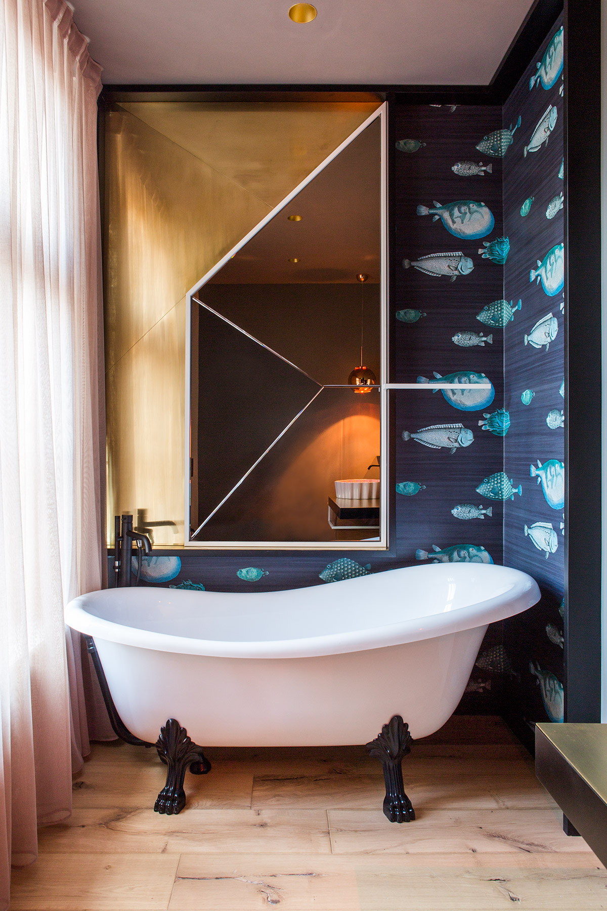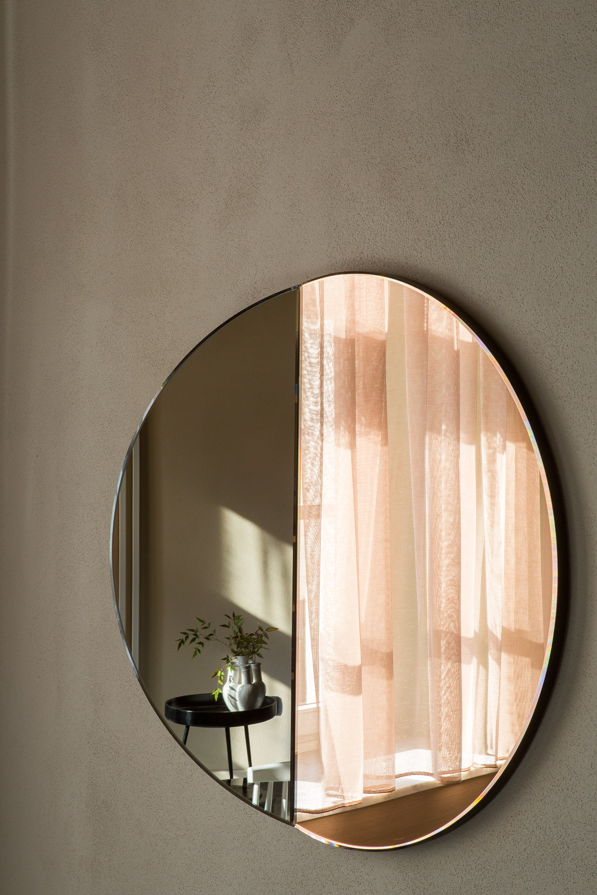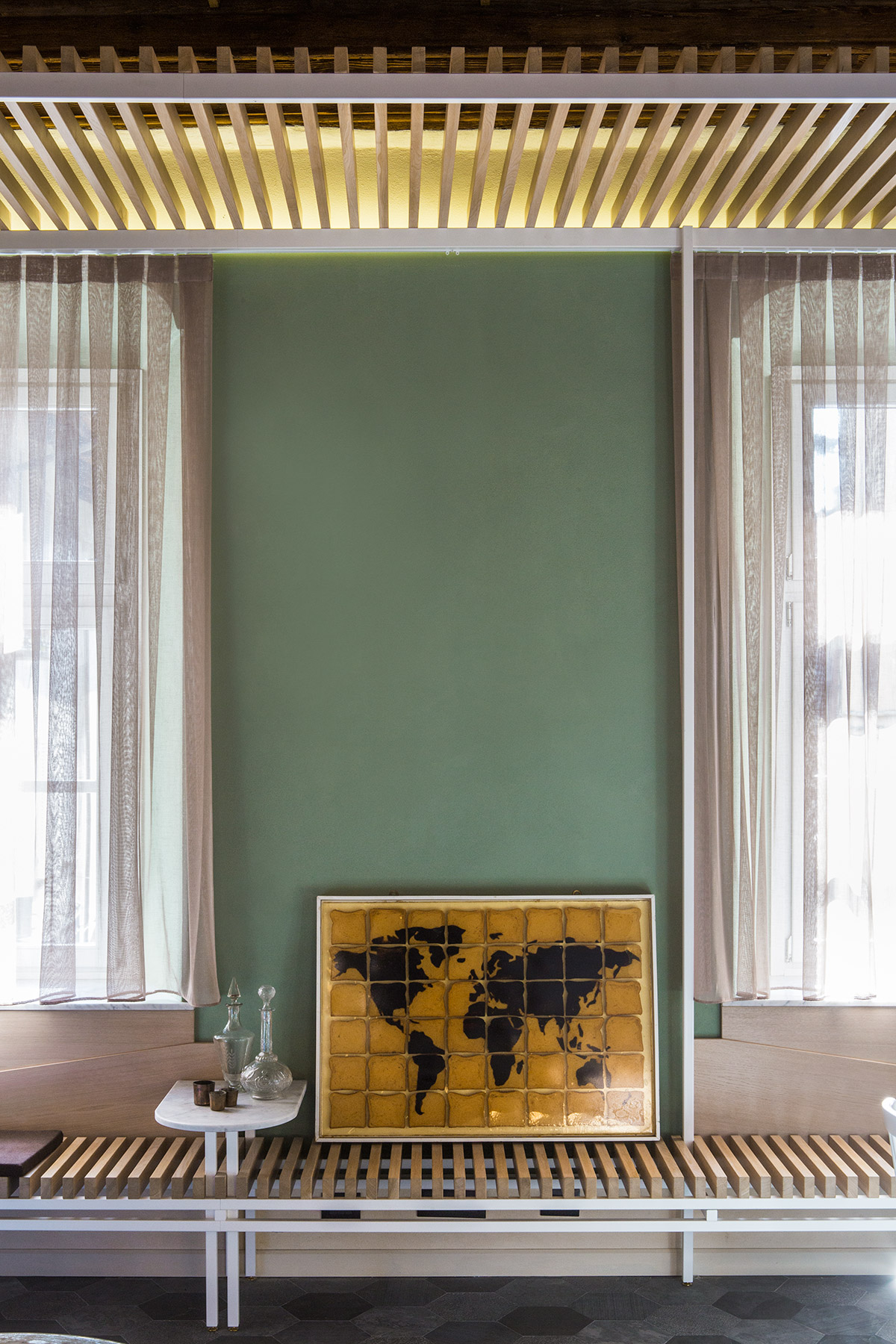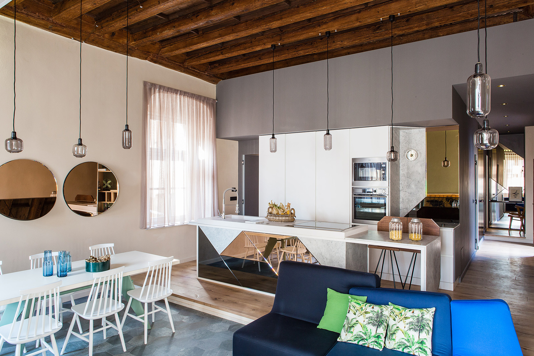 Materiali preziosi danno valore al tempo che passa e caratterizzano l’intervento. Rivestimenti di marmo Carrara nella cucina, rame per il basamento del letto e pelle vintage sulla testiera, ottone nel bagno padronale che si ossida con l’umidità e invecchia insieme alla torre. Specchi in tutti gli ambienti riflettono non solo la vista e la luce, ma anche la bellezza della casa, i suoi anni, i suoi soffitti a cassettoni e i suoi muri ruvidi, spessi e storti. Specchi di diverse forme e misure, irregolari e colorati propongono visuali inaspettate.