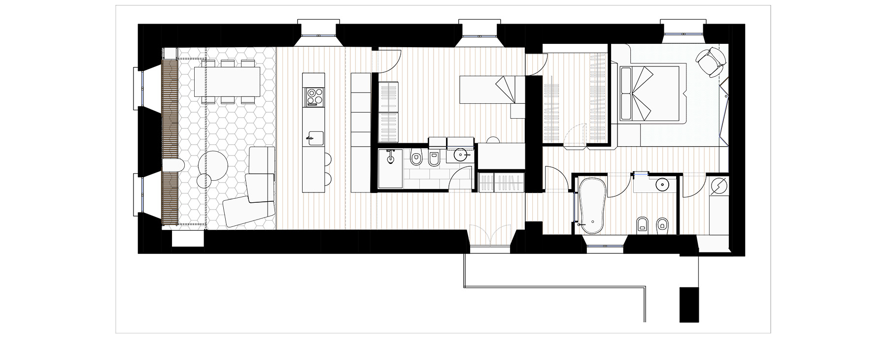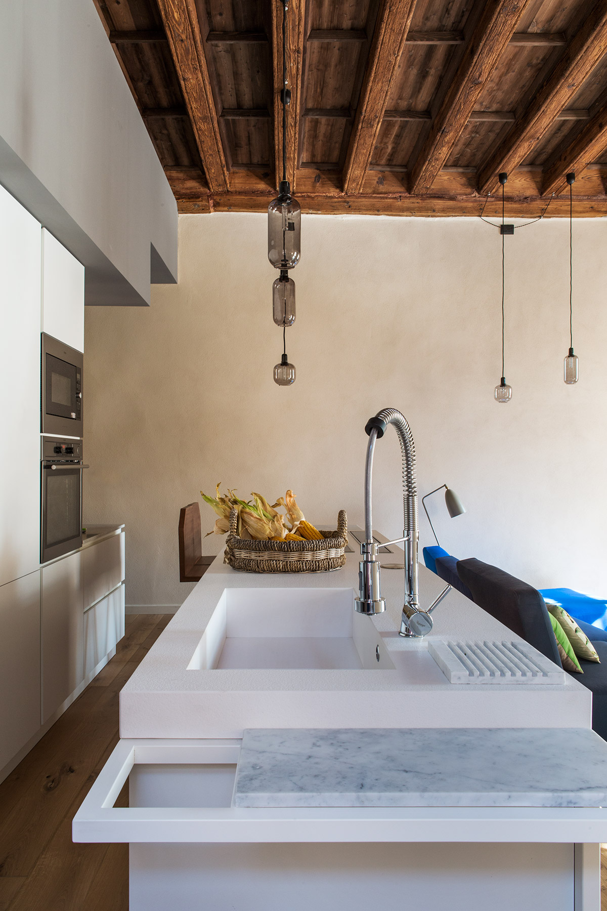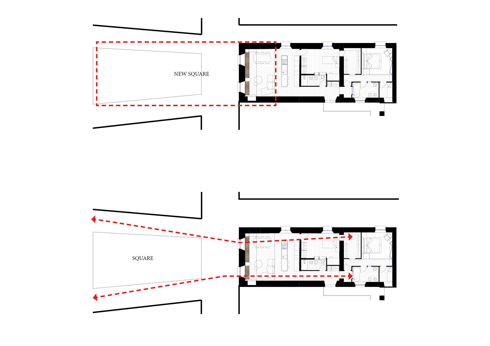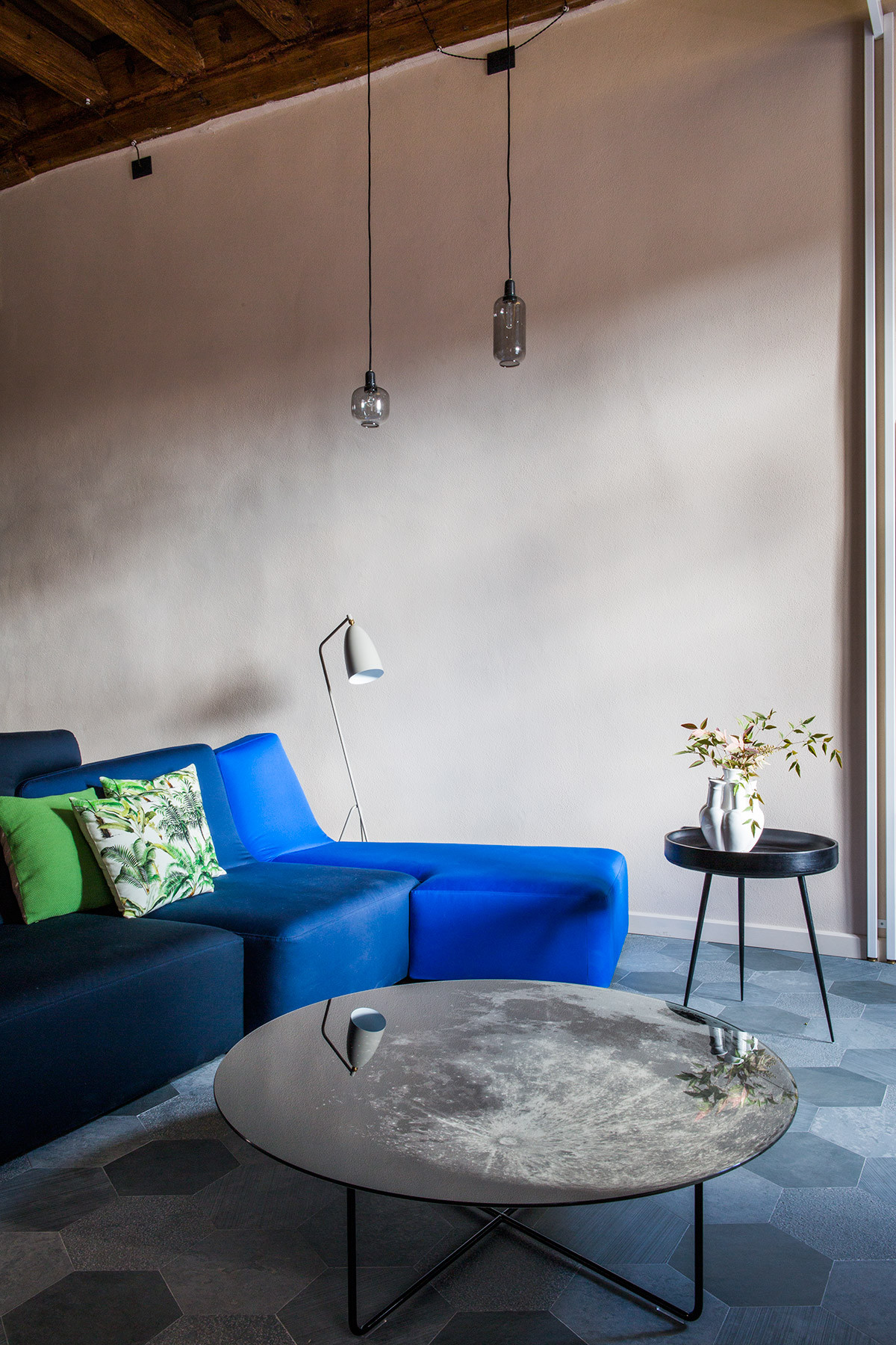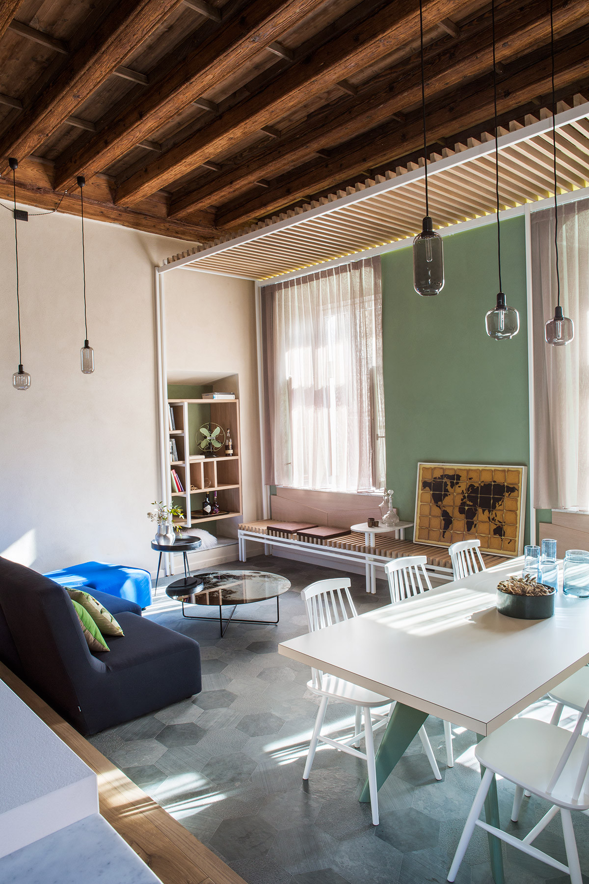 L’obiettivo era quello di valorizzare il legame visivo fra lo spazio pubblico del paese e l’interno della casa. Così, l’area verso la piazza ospita le zone pubbliche dell’appartamento: il soggiorno, la sala pranzo e la cucina previste con pavimentazione in pietra a moduli esagonali analogo al lastricato caratteristico delle piazze del paese. Le due finestre della zona giorno sono incorniciate da una nuova struttura metallica che ricorda le pensiline di attesa, una zona di sosta di Vigone, mentre il quadro di David Reimondo diventa la “mappa guida” di questo luogo. Il tavolino Luna di Moroso, in mezzo al soggiorno, è parte della “scenografia” rendendo l’ambiente uno spazio all’ aperto, sotto il cielo piemontese. Le strade della piazza continuano metaforicamente nell’ appartamento e la distribuzione interna evoca le vie strette del concentrico mediovale offrendo scorci inaspettati sul contesto guidandoti sempre verso piazza.