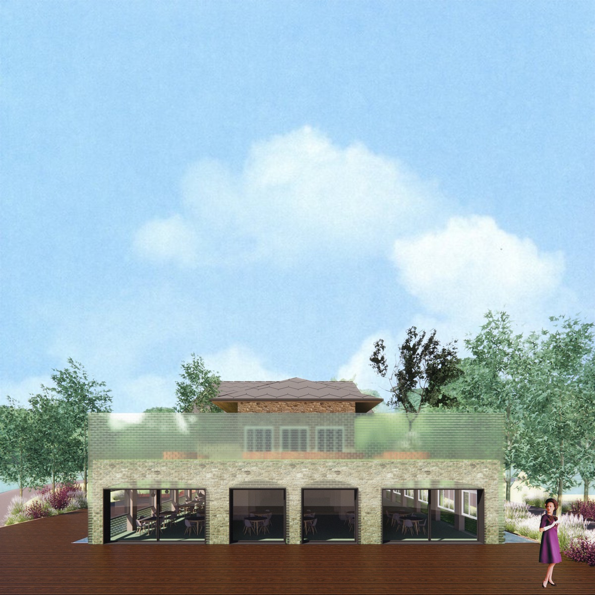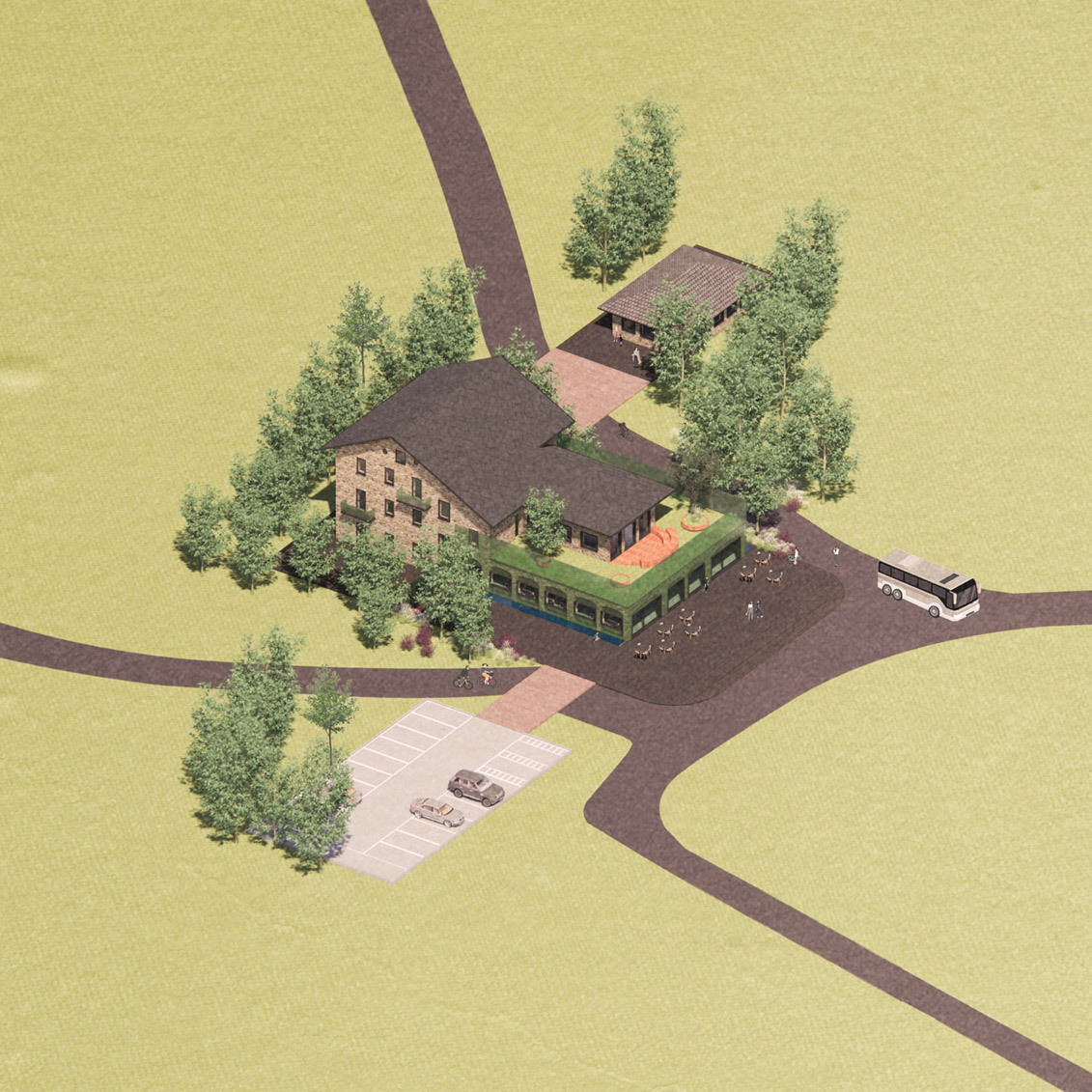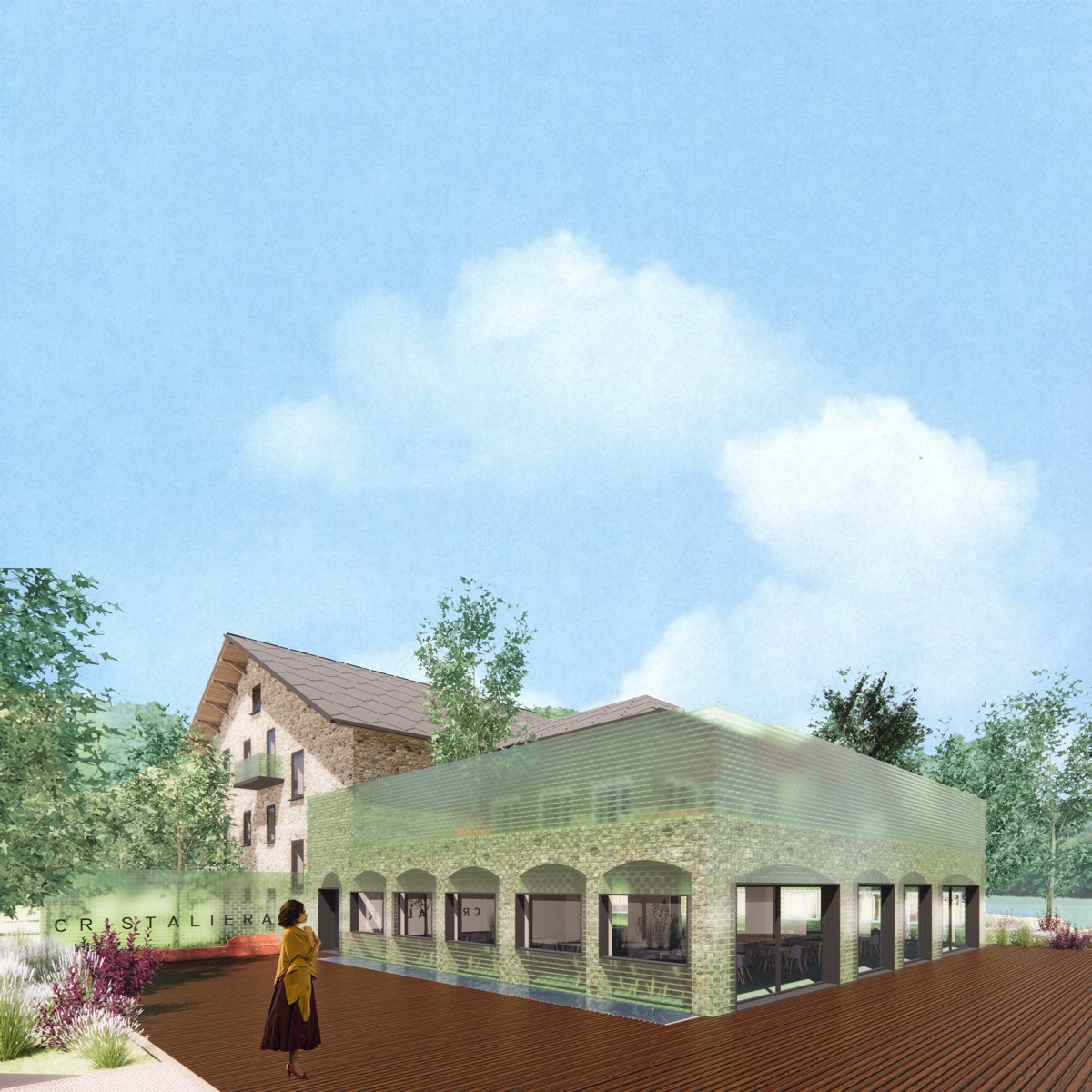 Per riportare alla luce gli antichi fasti si è pensato di ripristinare una struttura alberghiera rispettosa della storia dell’immobile ma reinterpretata con criteri contemporanei. Memoria, identità e luogo diventano un tutt’uno inscindibile nella creazione del progetto. I ricordi da condurre e custodire nel tempo vengono cristallizzati attraverso l’uso dei mattoni di vetro che avvolgono parte del basamento, svelando e proteggendo il passato. Una teca semitrasparente che crea un giardino all’ aperto sul terrazzo del primo piano. L’edificio si trova immerso alla natura e allo stesso tempo si protegge creando uno spazio introverso e mistico che cerca ti mantenere vive le storie e i racconti del passato.
