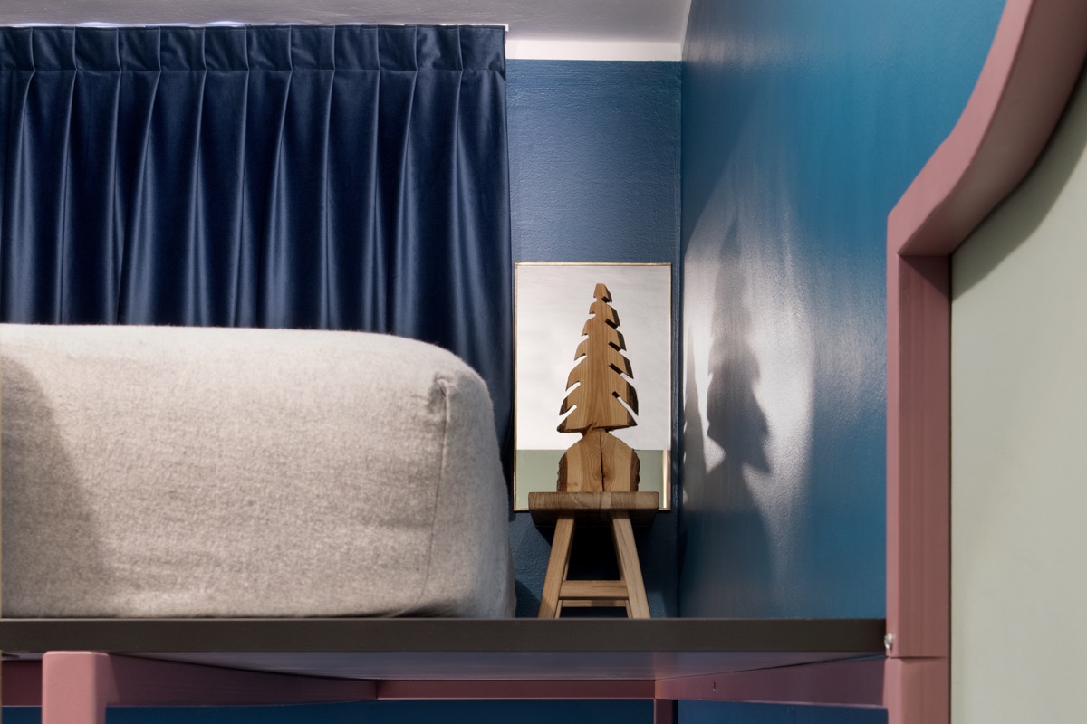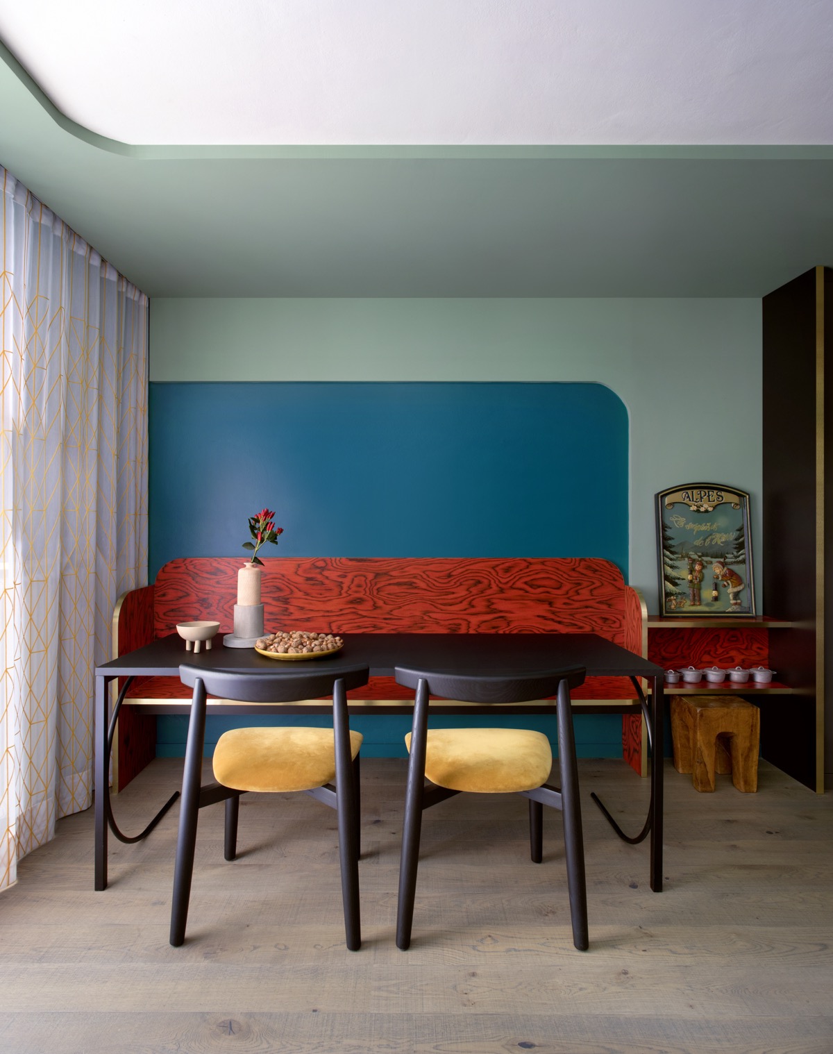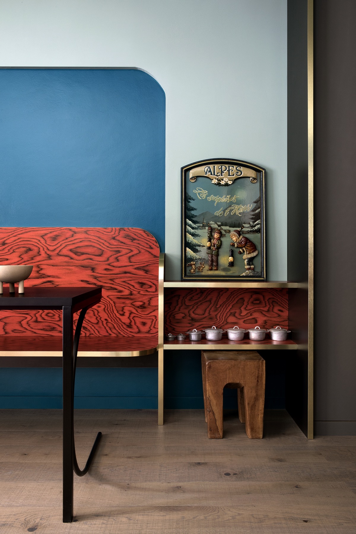 Al confine tra Italia e Francia, come un piccolo falò l’arredamento dell’appartamento di Claviere, da vita allo spazio che affaccia sul bosco autunnale. Il cuore della casa: la zona giorno e la zona pranzo, abbraccia l’uomo con i suoi schienali rossi. L’impiallacciato di Ettore Sottsass, iconico e unico, caratterizza tutto l’intervento. In soli trenta metri quadri prendono forma 6 posti letto, la cucina, il bagno e la sala pranzo. Una scenografia alpina accesa e calda come un fuoco, ospita la vita in montagna.