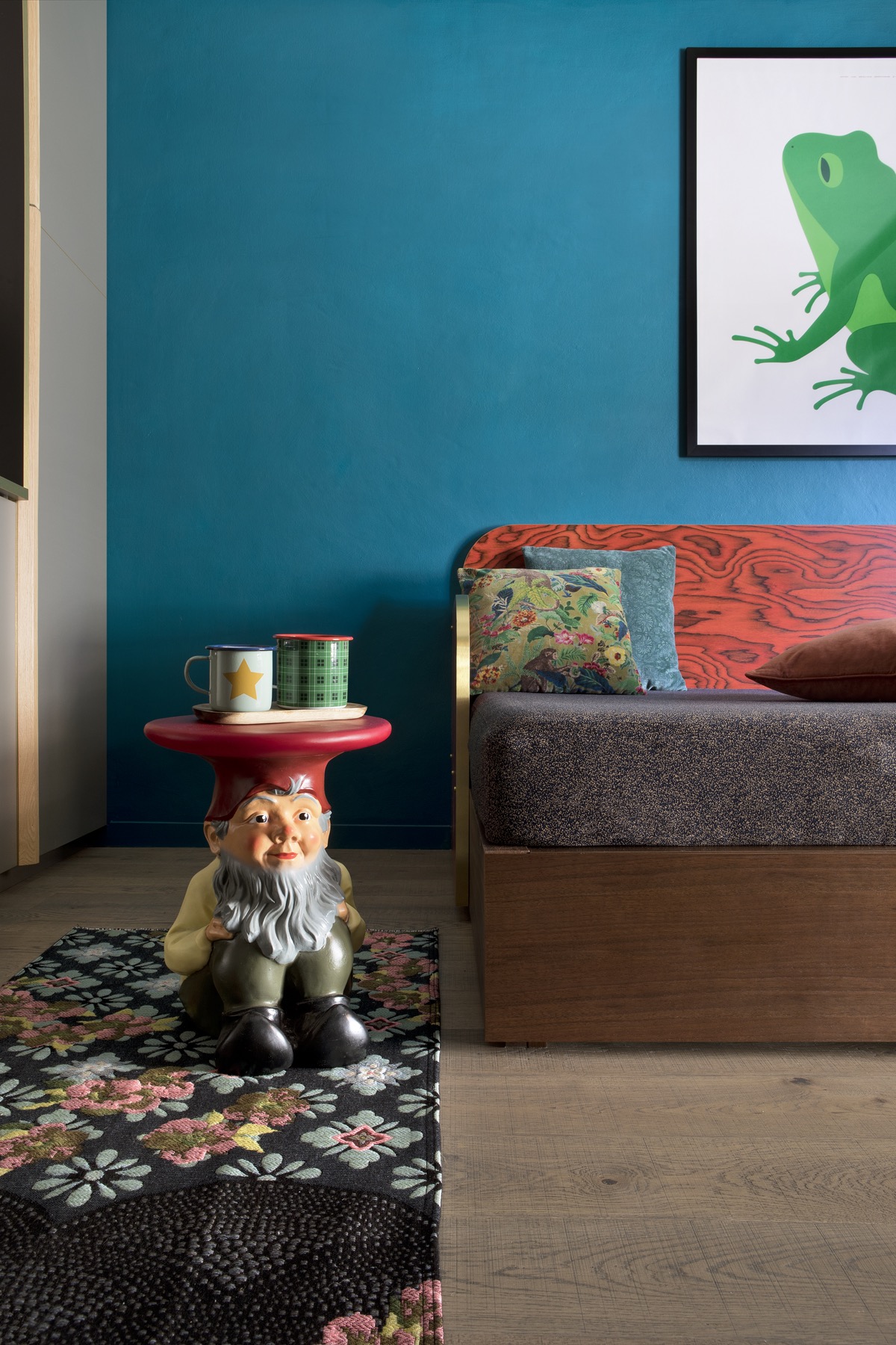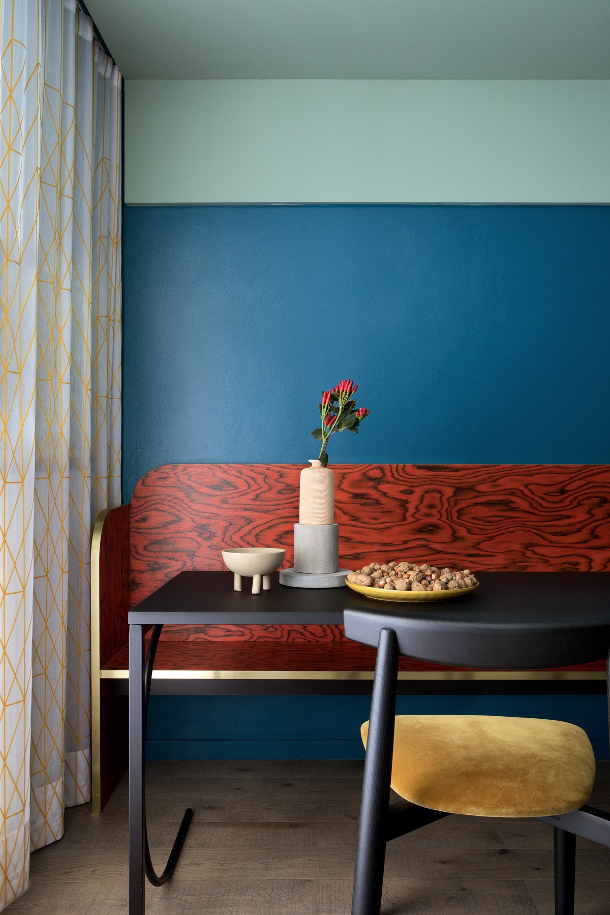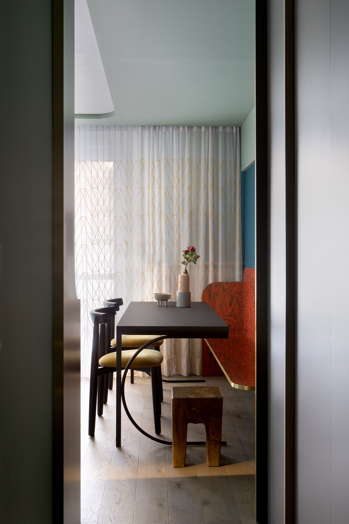 Al confine tra Italia e Francia, come un piccolo falò l’arredamento dell’appartamento di Claviere, da vita allo spazio che affaccia sul bosco autunnale. Il cuore della casa: la zona giorno e la zona pranzo, abbraccia l’uomo con i suoi schienali rossi. L’impiallacciato di Ettore Sottsass, iconico e unico, caratterizza tutto l’intervento. In soli trenta metri quadri prendono forma 6 posti letto, la cucina, il bagno e la sala pranzo. Una scenografia alpina accesa e calda come un fuoco, ospita la vita in montagna.