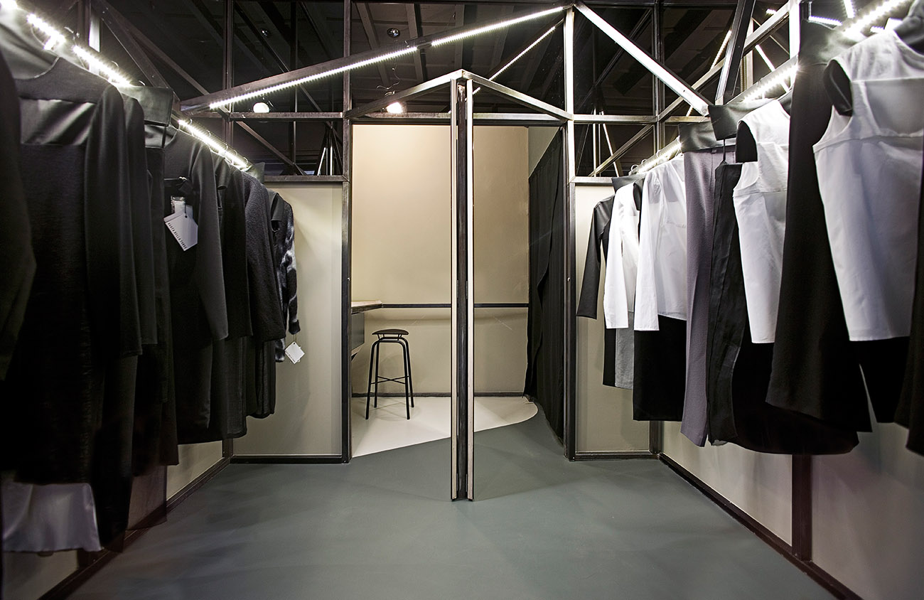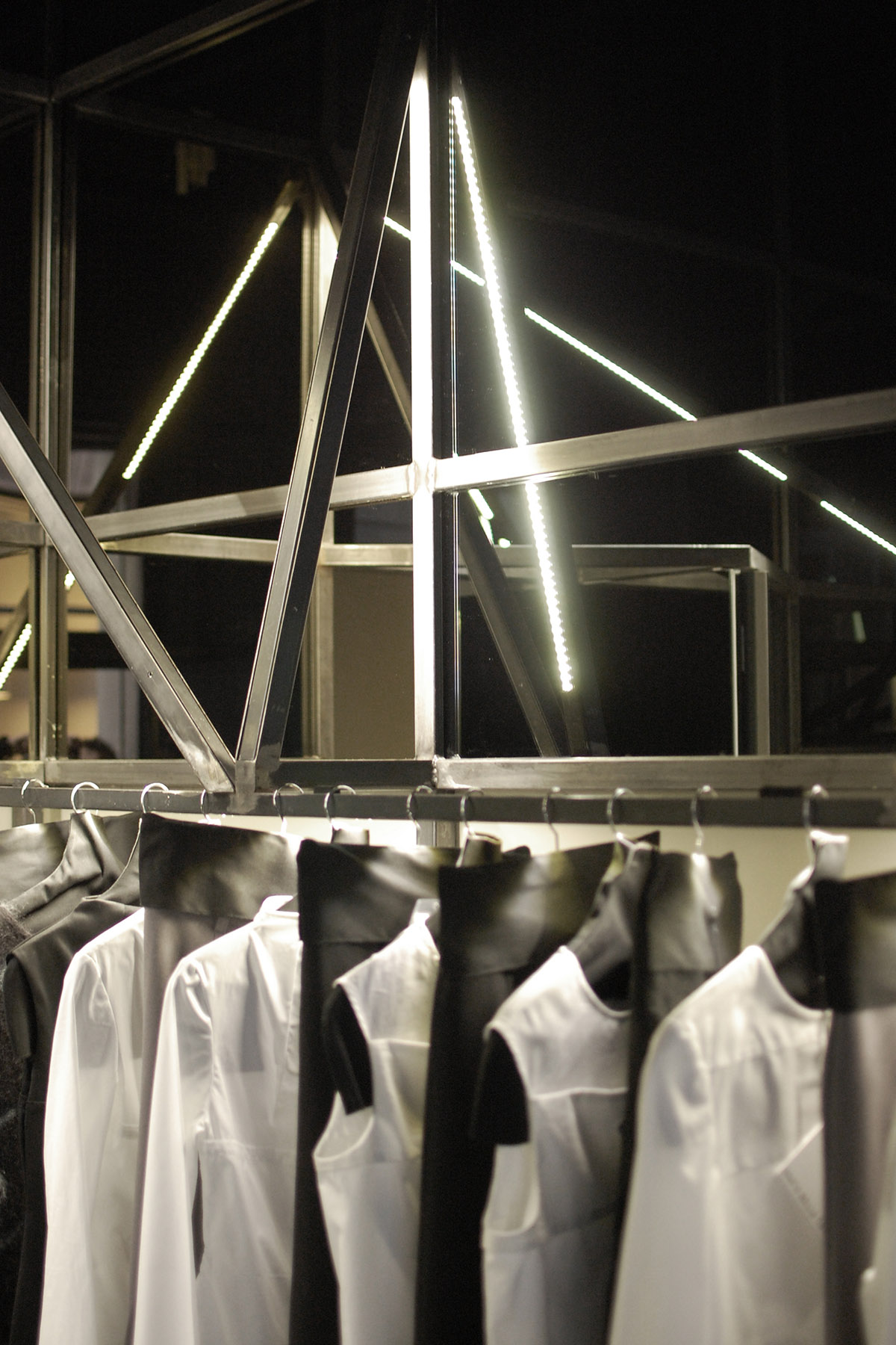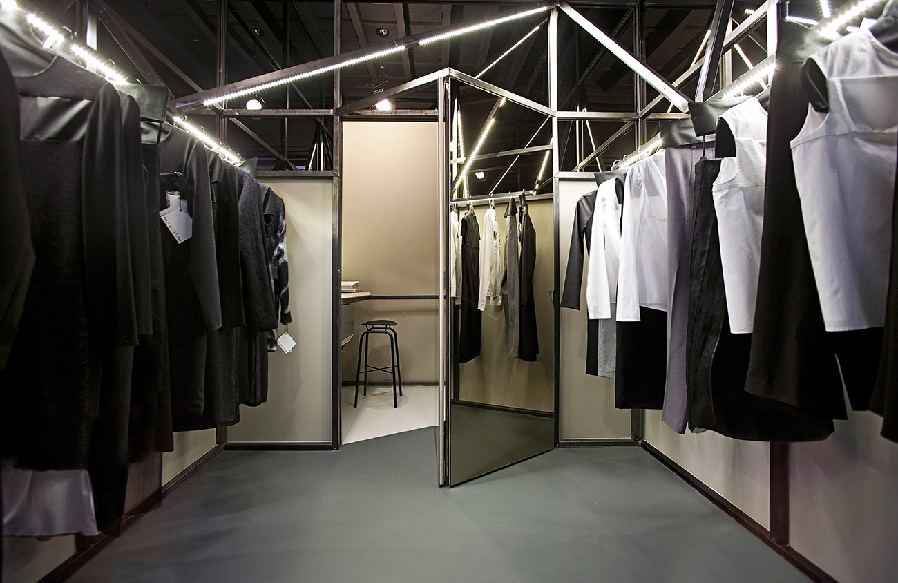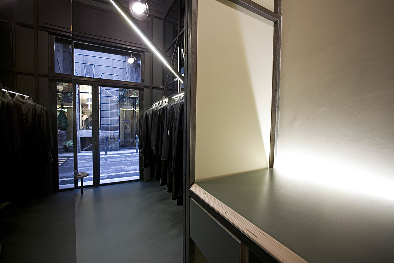 Gli specchi posizionati ad altezza uomo, davanti alle due porte frontali all’entrata, riflettono i capi laterali creando una nuova vetrina su strada. Le superfici al di sopra degli abiti moltiplicano all’infinito lo spazio generando un tetto senza confini.
