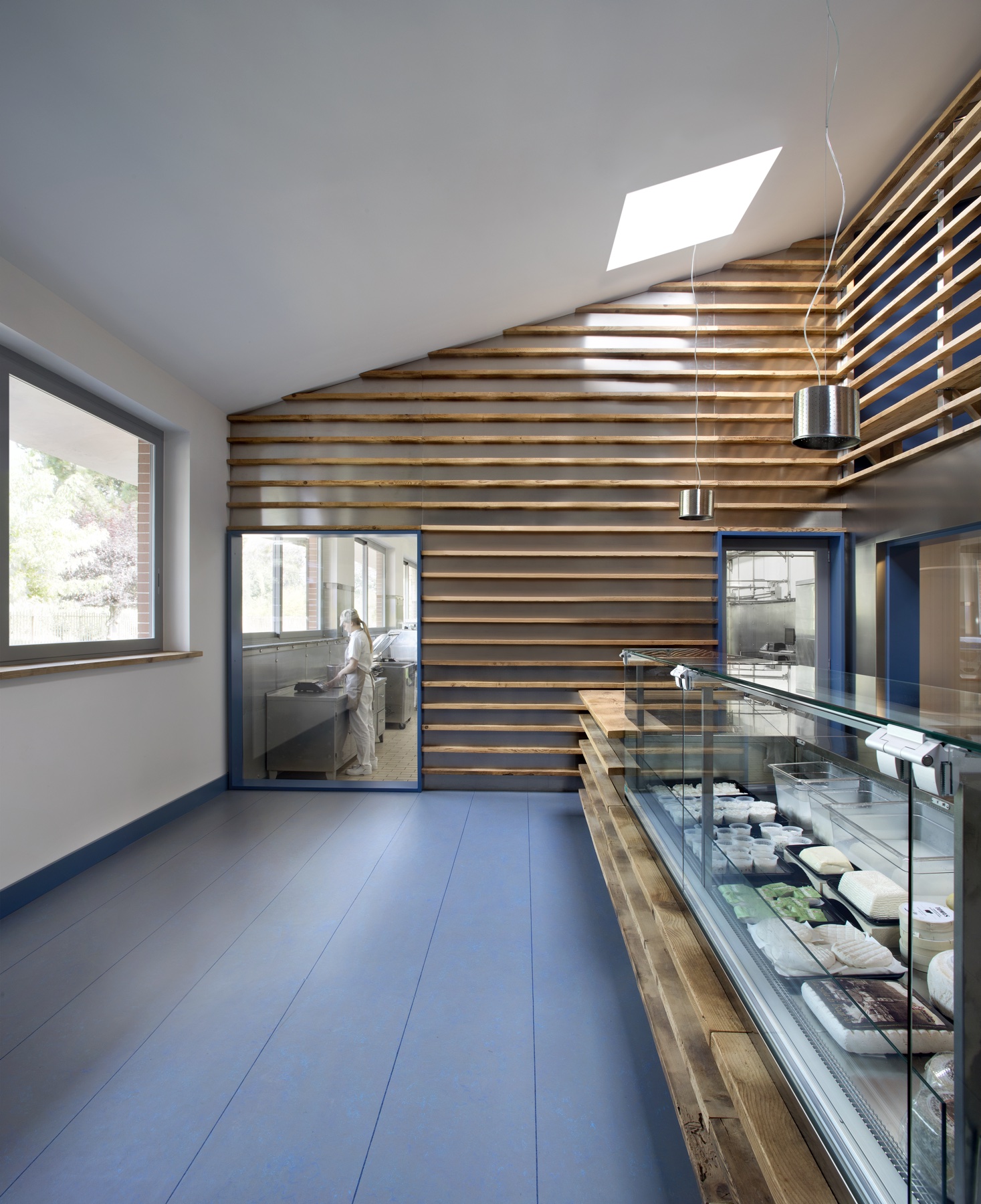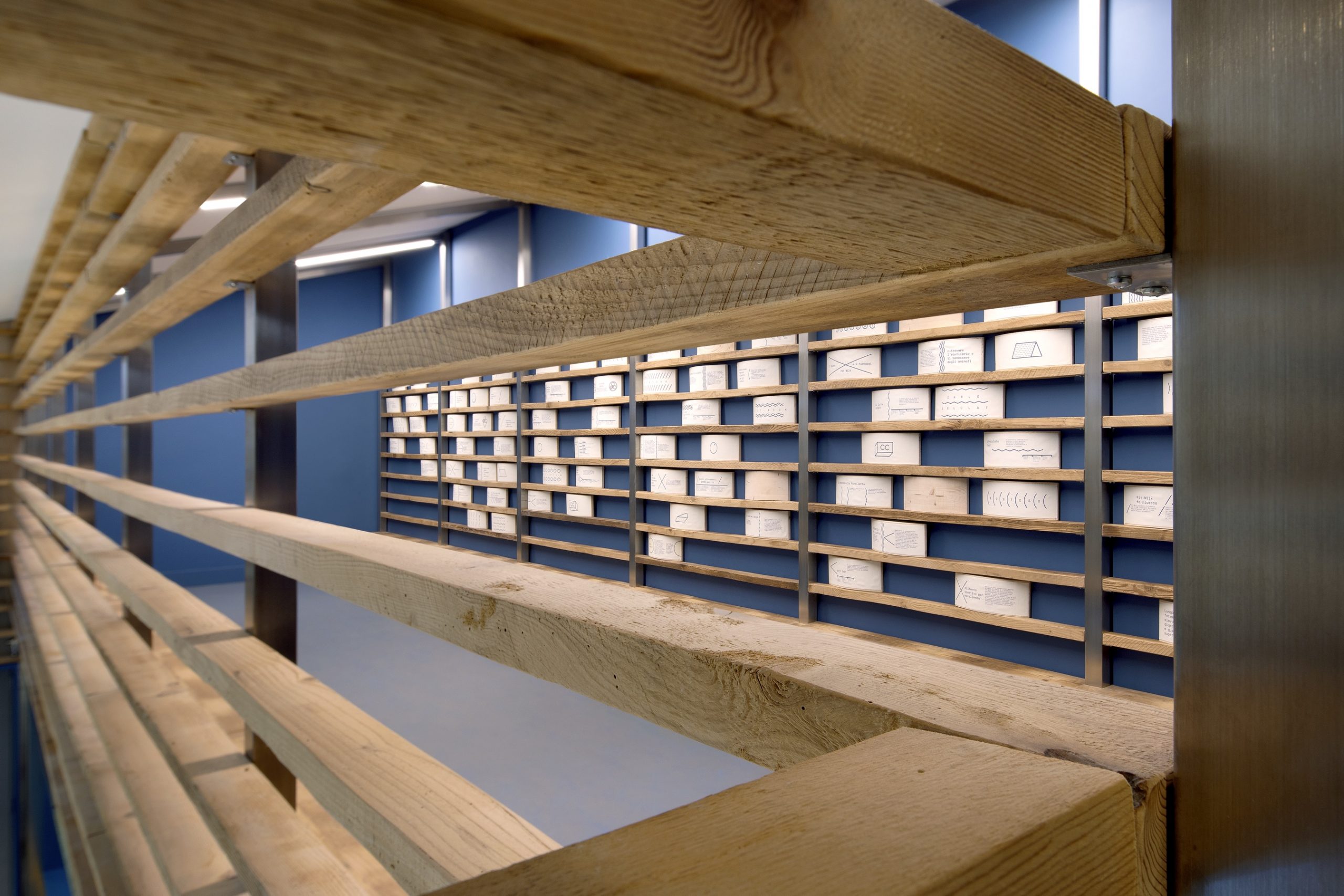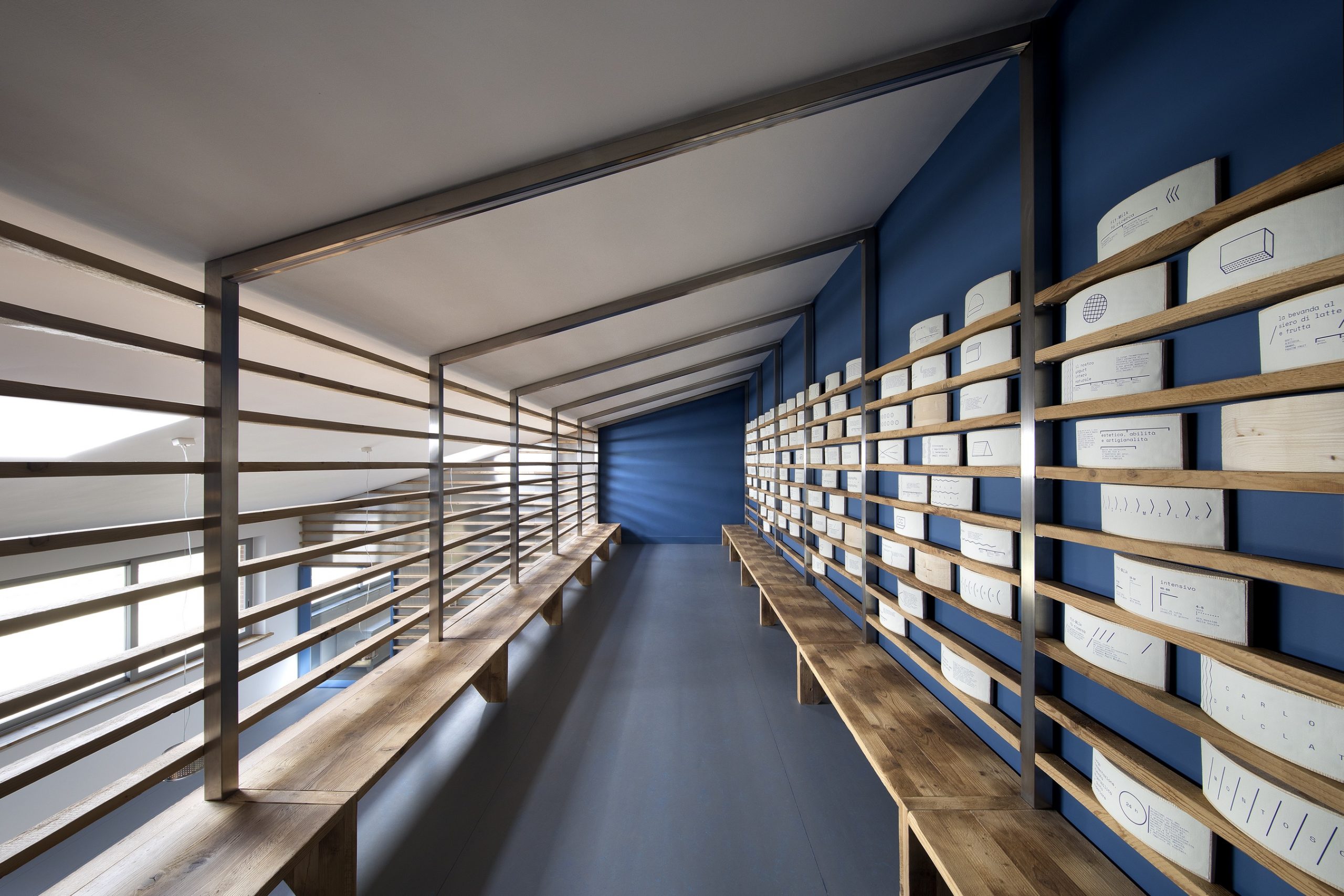 Un lavoro che unisce nella sua espressione arte, design e grafica. Maestro della progettazione l’artista Hilario Isola affiancato dallo studio SCEG Architetti e dallo studio di grafica ELYRON. Committenza formata da due giovani e illuminati fratelli che cercano la qualità e l’innovazione come massima espressione tecnica, applicata a tutti i livelli. L’ idea principale era quella di lavorare con i materiali del luogo, del caseificio che affianca il punto vendita. In questo caso ci sono due “ingredienti” principali: il riutilizzo dei i vecchi assi di stagionatura in legno che sono segnati dal tempo e dall’ uso, e le lastre di acciaio inossidabile (inox): un materiale freddo e riflettente che completa l’immagine di uno spazio di produzione. Le impronte delle forme dei formaggi sul legno ripulito diventano pattern, scenografia e grafica che raccontano la storia. Le assi rivestono quasi tutto il negozio e diventano pareti, bancone, scala e mensole, creando un architettura di interni che si trasforma all’ esterno nell’ emblema del negozio: il Totem, una “fetta” di formaggio che evidenzia l’ ingresso da lontano. Il negozio si sviluppa in due livelli. Al piano terra lo spazio di vendita si collega visivamente attraverso le vetrate, non solo con lo spazio di produzione, ma anche con la cella principale di stagionatura che diventa un quadro in esposizione per il cliente. In mezzo il bancone di vendita che ospita formaggi e gelati. Al secondo livello si trova un spazio di incontro fra cliente e informazione. ELYRON ha creato una “libreria” applicando informazioni molto eterogenee su forme di tome in legno. L’ esposizione si colloca sopra la cella del piano terra dando continuità al prodotto e cercando di interpretare l’informazione in una maniera iconica e integrata con lo spazio. Il cliente si sente immerso in un’esperienza unica e attiva che collega visivamente tutte le fasi di realizzazione del prodotto a km.0 della produzione alla vendita finale.