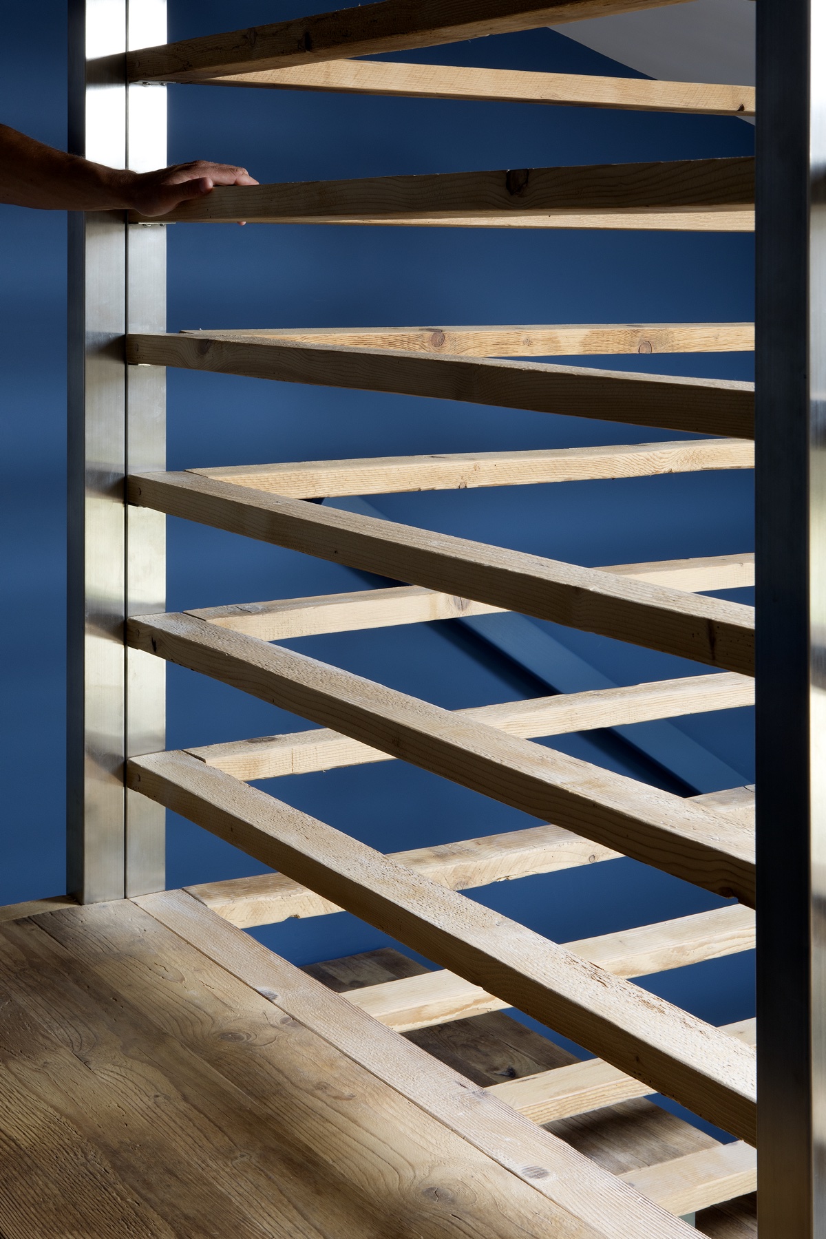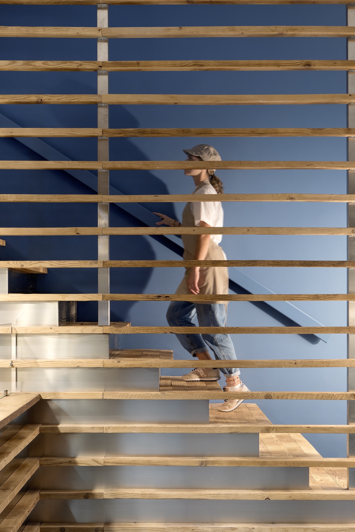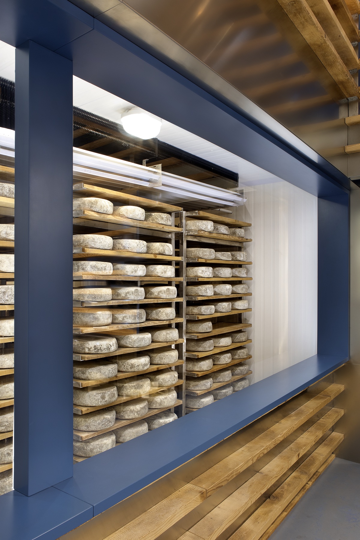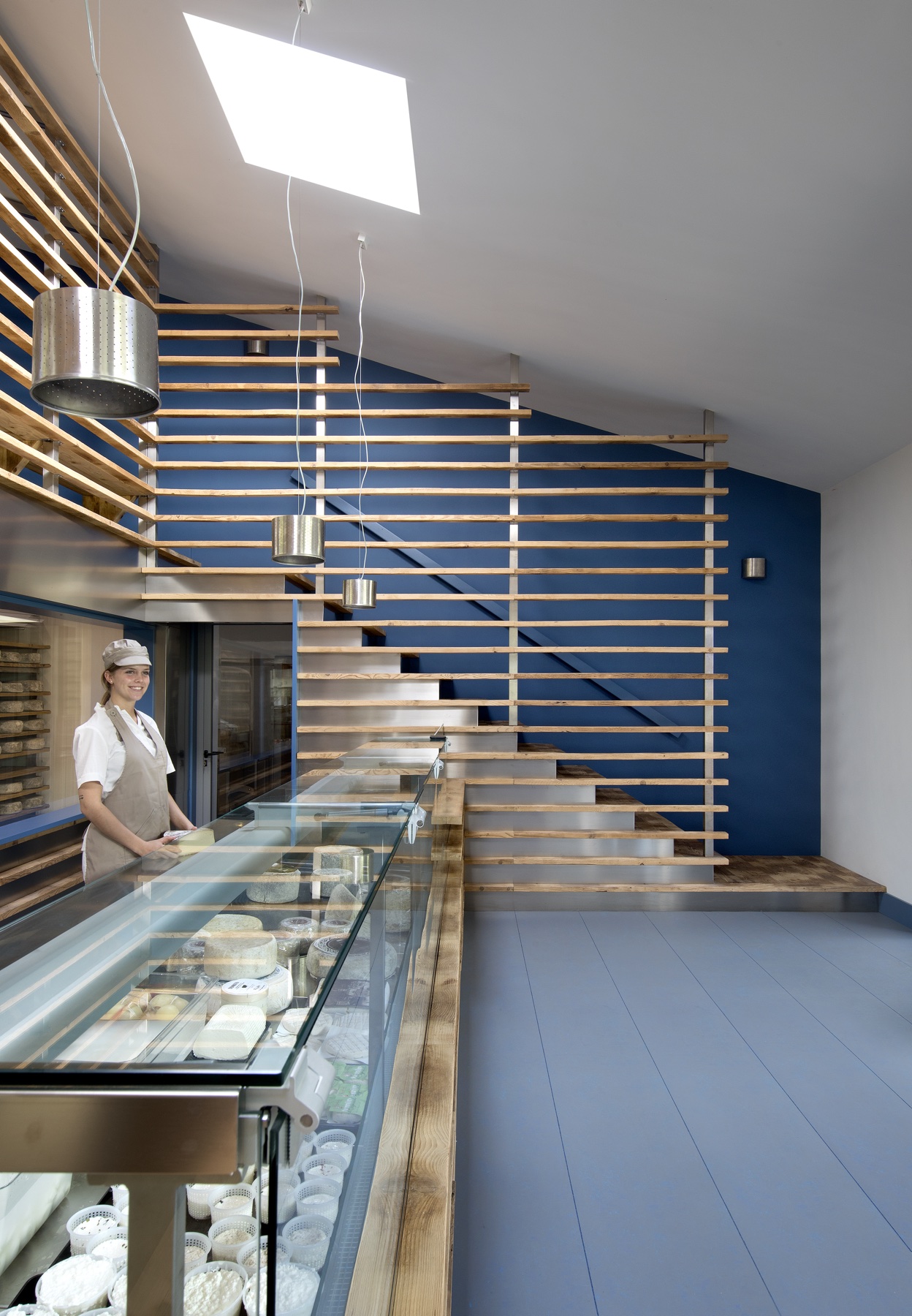 Un lavoro che unisce nella sua espressione arte, design e grafica. Maestro della progettazione l’artista Hilario Isola affiancato dallo studio SCEG Architetti e dallo studio di grafica ELYRON. Committenza formata da due giovani e illuminati fratelli che cercano la qualità e l’innovazione come massima espressione tecnica, applicata a tutti i livelli. L’ idea principale era quella di lavorare con i materiali del luogo, del caseificio che affianca il punto vendita. In questo caso ci sono due “ingredienti” principali: il riutilizzo dei i vecchi assi di stagionatura in legno che sono segnati dal tempo e dall’ uso, e le lastre di acciaio inossidabile (inox): un materiale freddo e riflettente che completa l’immagine di uno spazio di produzione. Le impronte delle forme dei formaggi sul legno ripulito diventano pattern, scenografia e grafica che raccontano la storia. Le assi rivestono quasi tutto il negozio e diventano pareti, bancone, scala e mensole, creando un architettura di interni che si trasforma all’ esterno nell’ emblema del negozio: il Totem, una “fetta” di formaggio che evidenzia l’ ingresso da lontano. Il negozio si sviluppa in due livelli. Al piano terra lo spazio di vendita si collega visivamente attraverso le vetrate, non solo con lo spazio di produzione, ma anche con la cella principale di stagionatura che diventa un quadro in esposizione per il cliente. In mezzo il bancone di vendita che ospita formaggi e gelati. Al secondo livello si trova un spazio di incontro fra cliente e informazione. ELYRON ha creato una “libreria” applicando informazioni molto eterogenee su forme di tome in legno. L’ esposizione si colloca sopra la cella del piano terra dando continuità al prodotto e cercando di interpretare l’informazione in una maniera iconica e integrata con lo spazio. Il cliente si sente immerso in un’esperienza unica e attiva che collega visivamente tutte le fasi di realizzazione del prodotto a km.0 della produzione alla vendita finale.