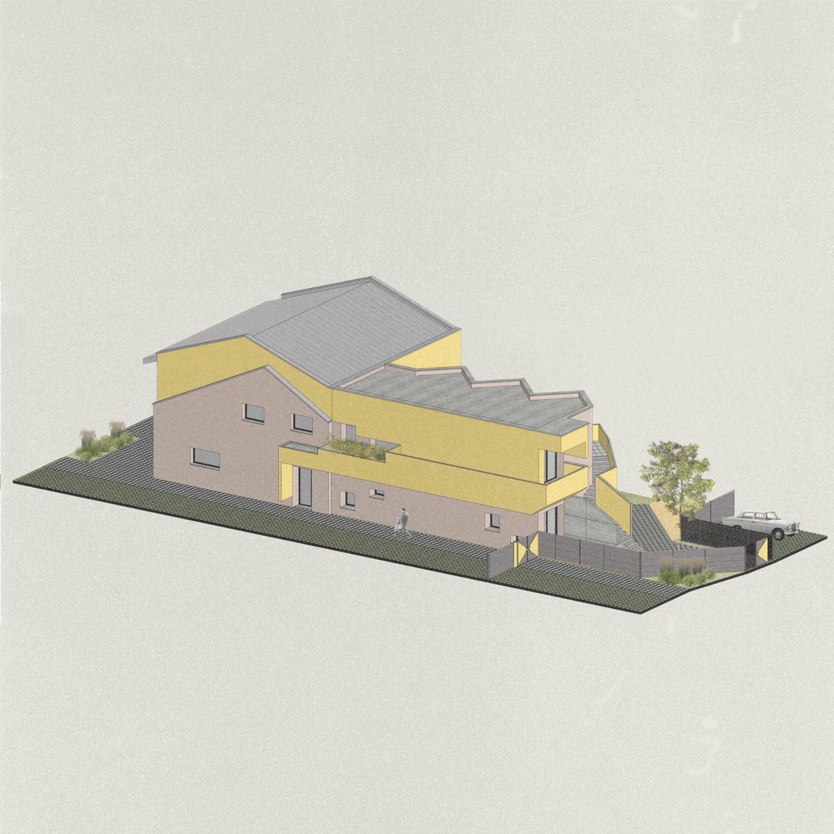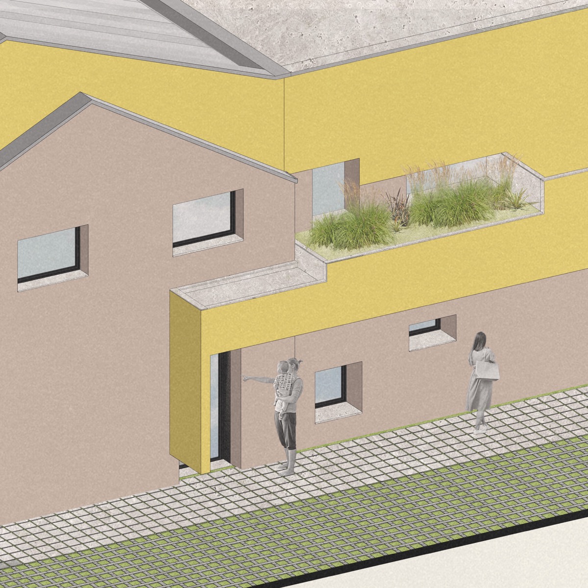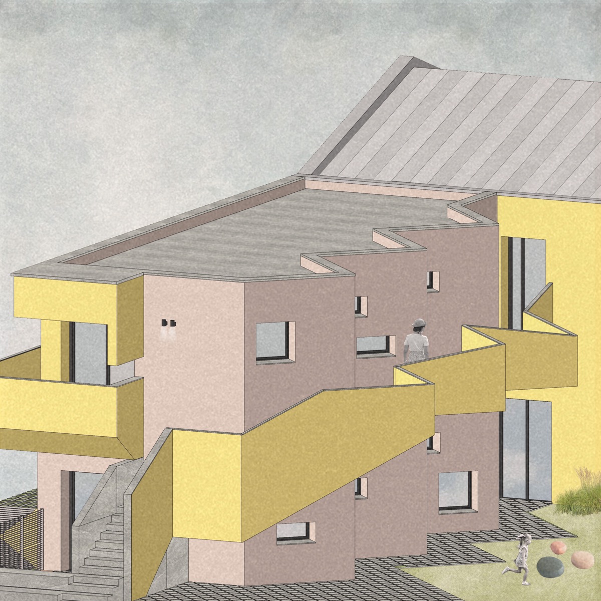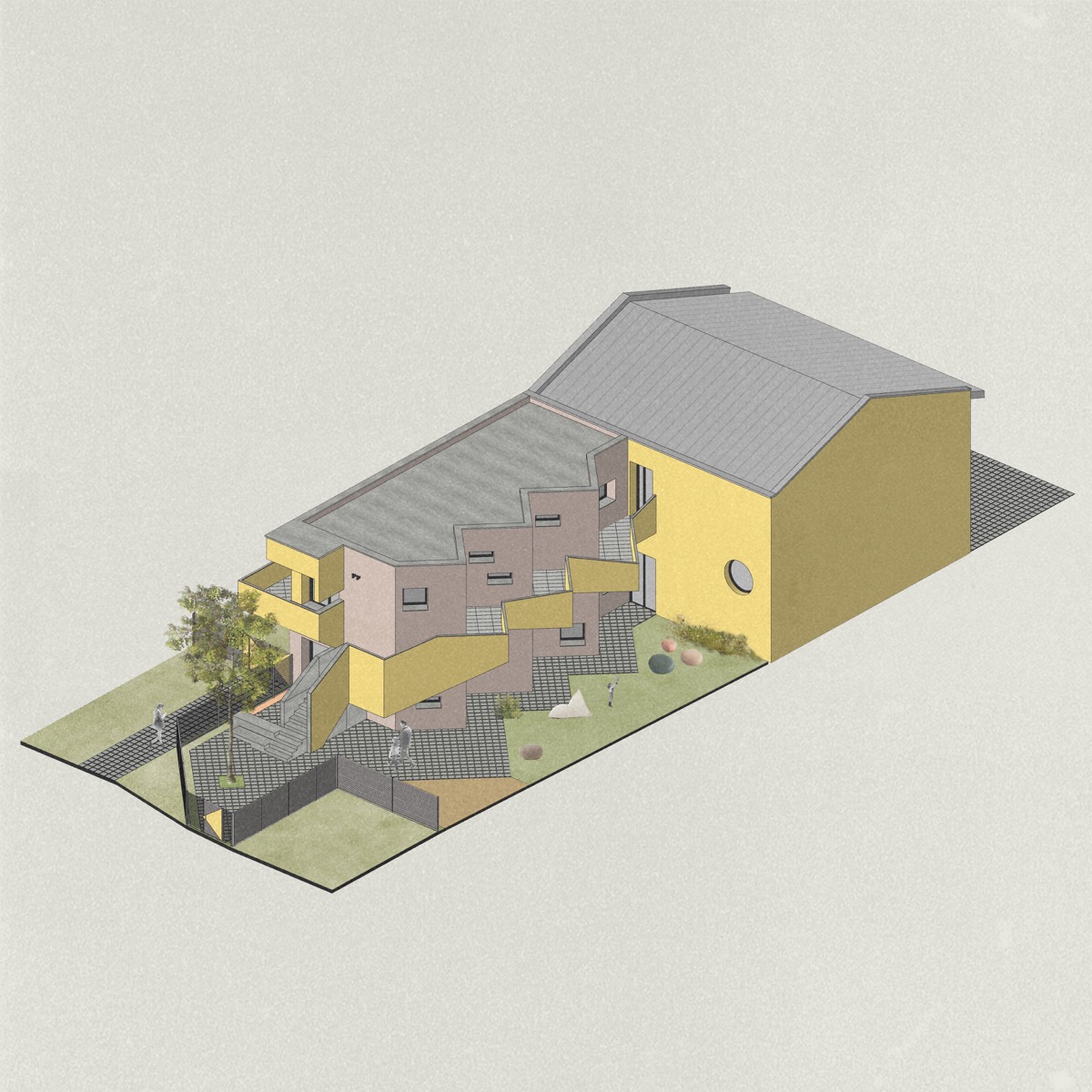 Nuove volumetrie giocose e vivaci che dialogano con manufatti esistenti realizzando sequenze di spazi sagomati armoniosi e suggestivi, valorizzando il tessuto urbano e sociale del piccolo paese in cui si insediano. L’edifizio diventa iconico attraverso la forma ludica della saetta e abbraccia nei suoi spazi le attività della scuola. Uno spazio pensato in senso pedagogico, dove nella sua articolazione interna ed esterna nulla è casuale, in cui i piccoli utenti “sprigioneranno la loro energia” in spazi complessi e allo stesso tempo straordinariamente familiari.