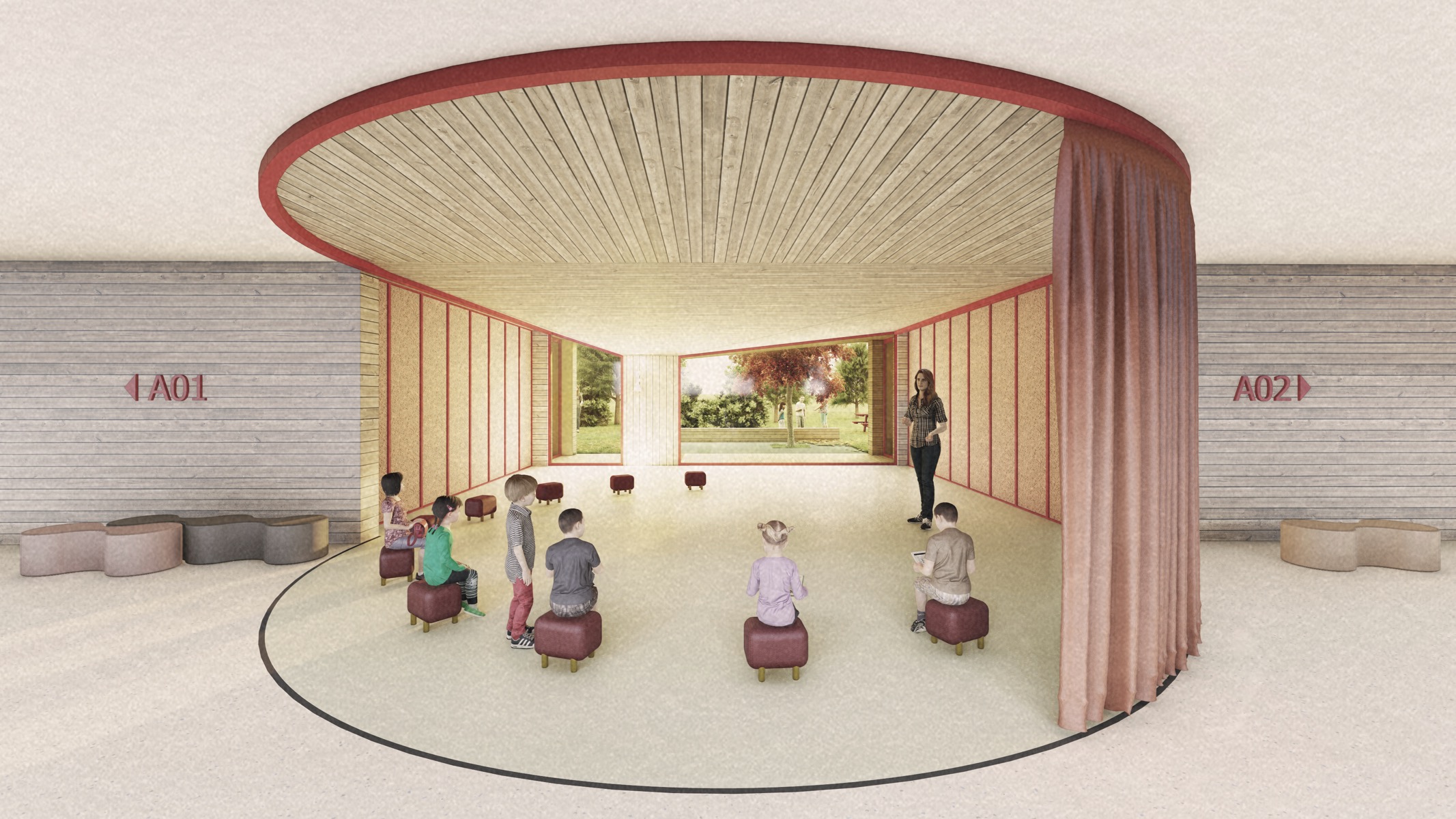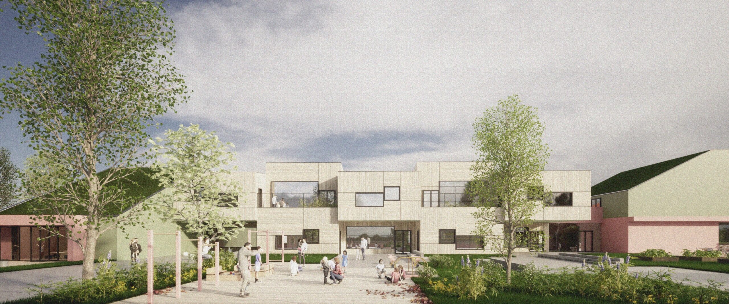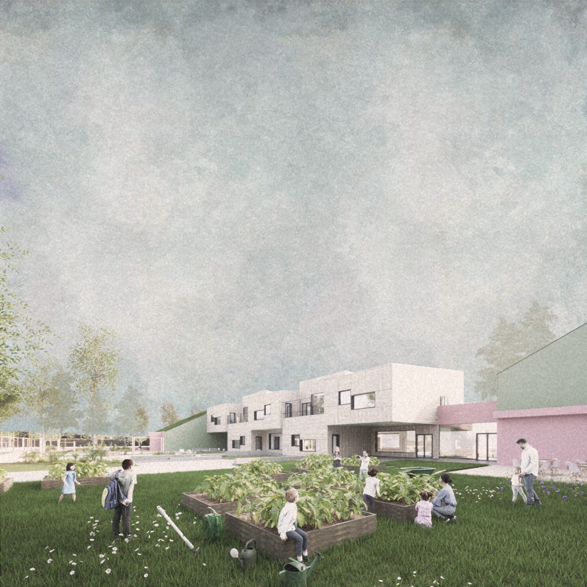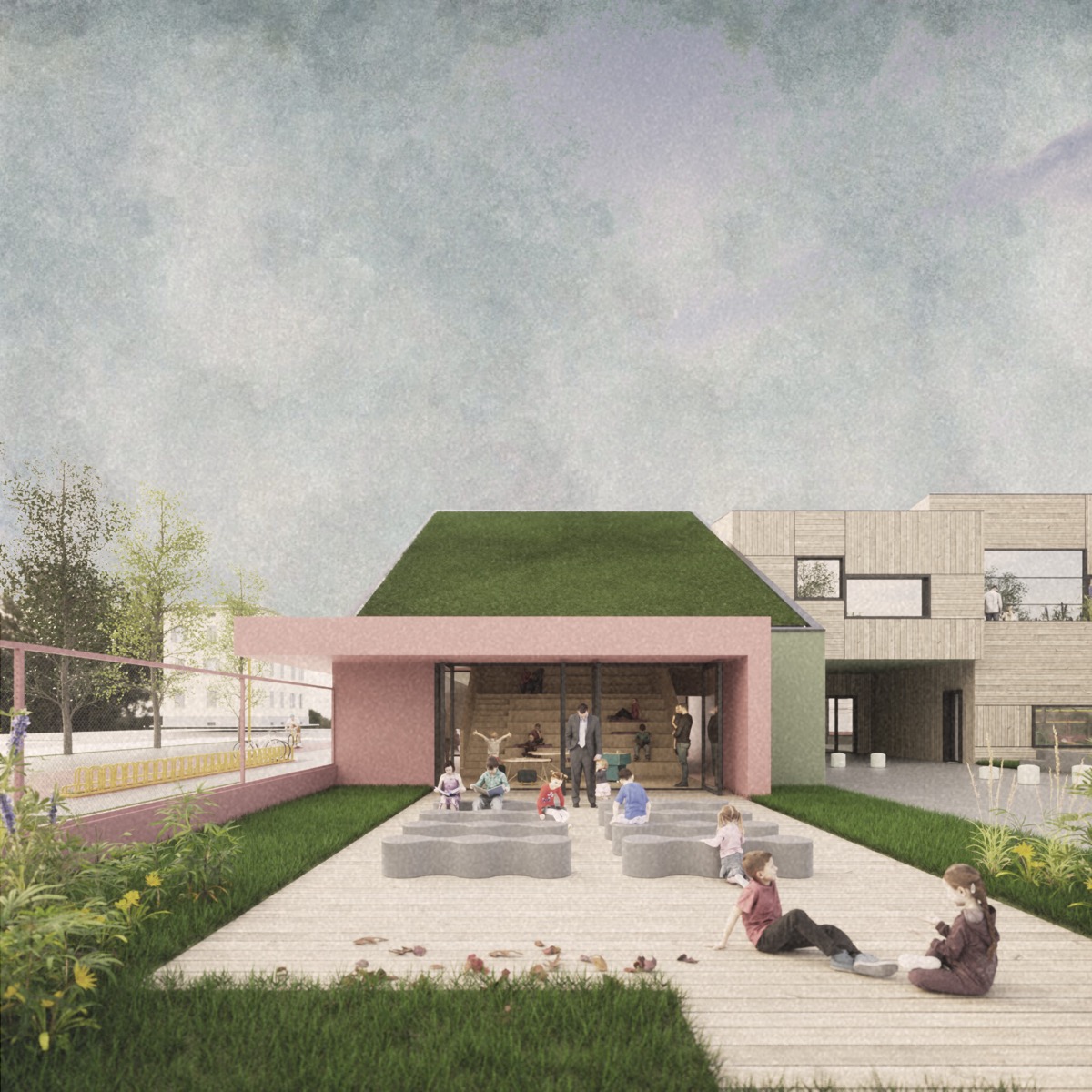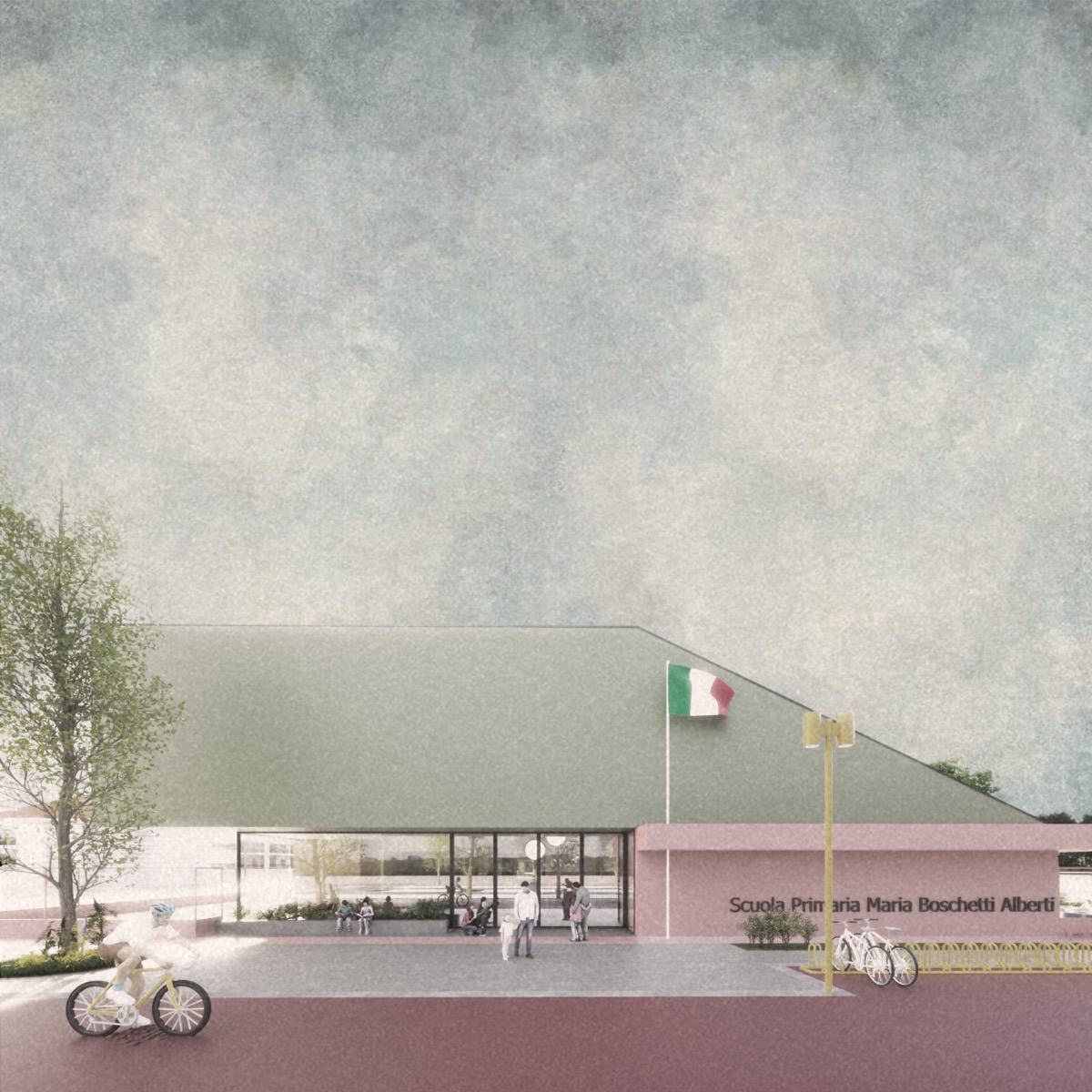 Su tali premesse la nuova scuola è pensata come uno spazio permeabile e flessibile. La dinamicità è ottenuta attraverso l’alternanza tra pieno e vuoto, con volumi scomposti su due livelli. Ogni aula sarà riconoscibile, i bambini potranno identificare la loro classe come la propria casa. L’edificio assume un’immagine in movimento, definendo un doppio livello di spazi, quello esterno delle terrazze e delle corti tra le aule, e quello interno ospitanti le funzioni.