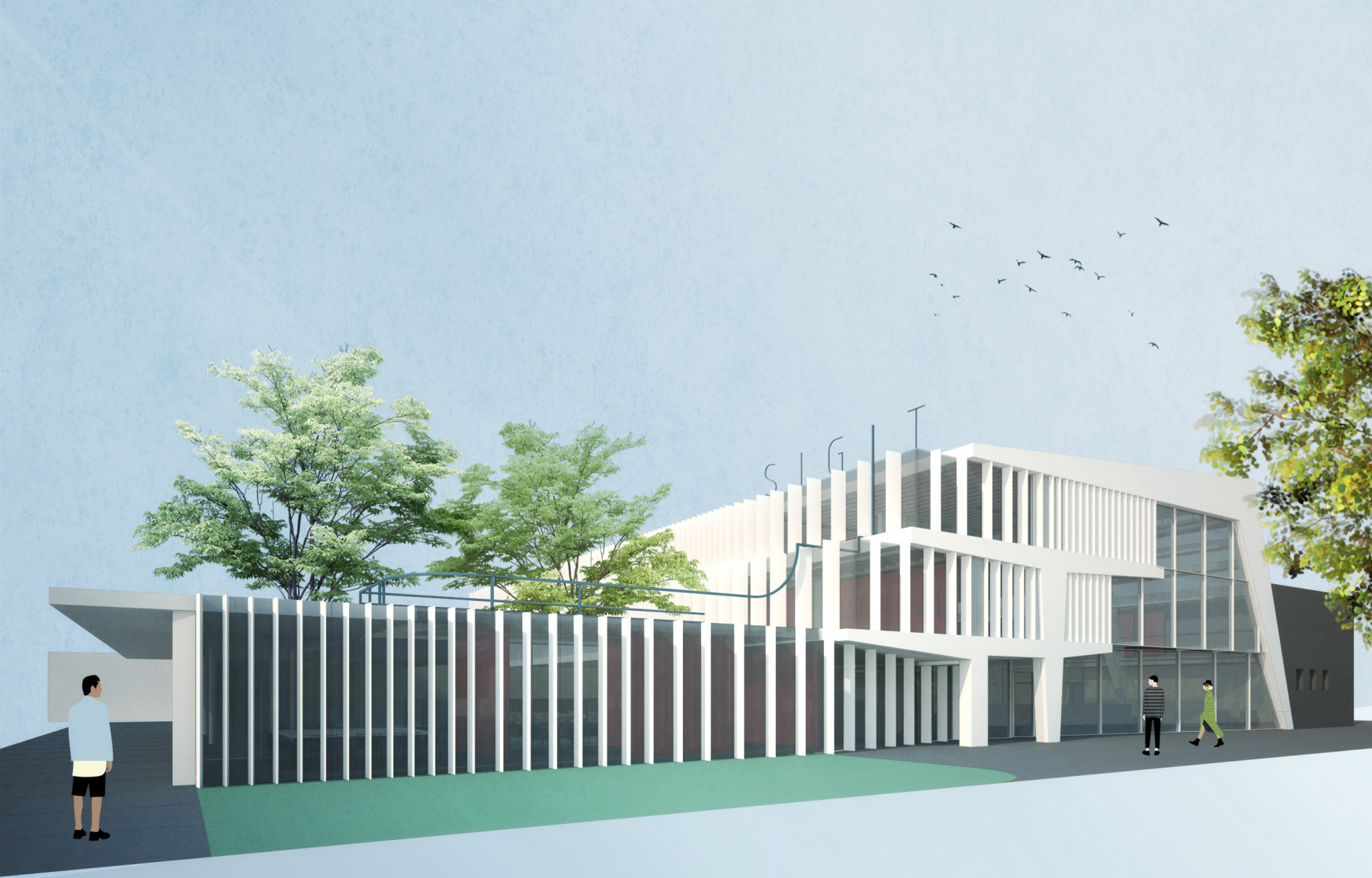 estensione dell’edificio attraverso una manica posta alla quota del giardino, collegata direttamente al piano terra dell’edificio esistente. In questo modo viene recuperata parte della superficie mancante richiesta e si viene a creare una nuova corte che delimita lo spazio pubblico esterno, enfatizzando il collegamento visivo e fisico tra la navata e il paesaggio;