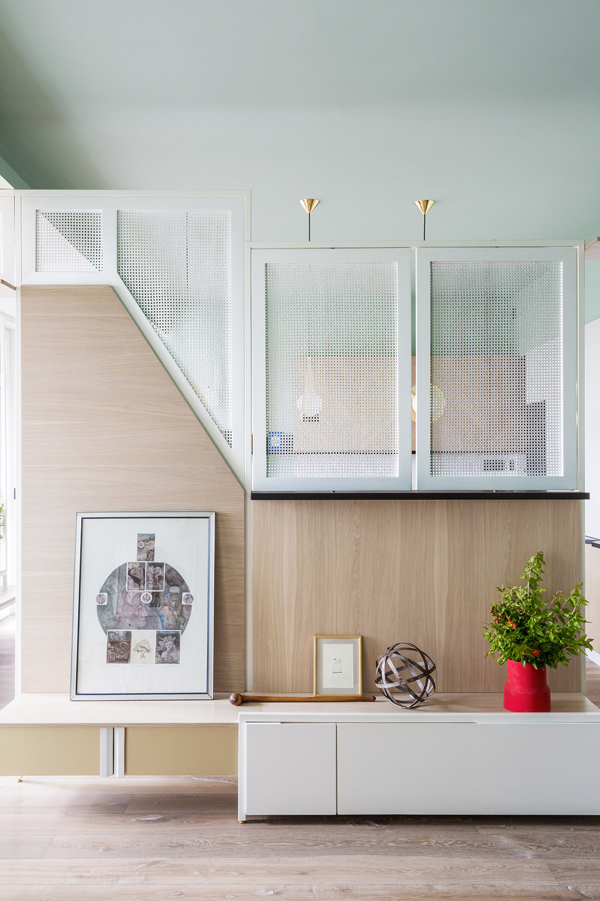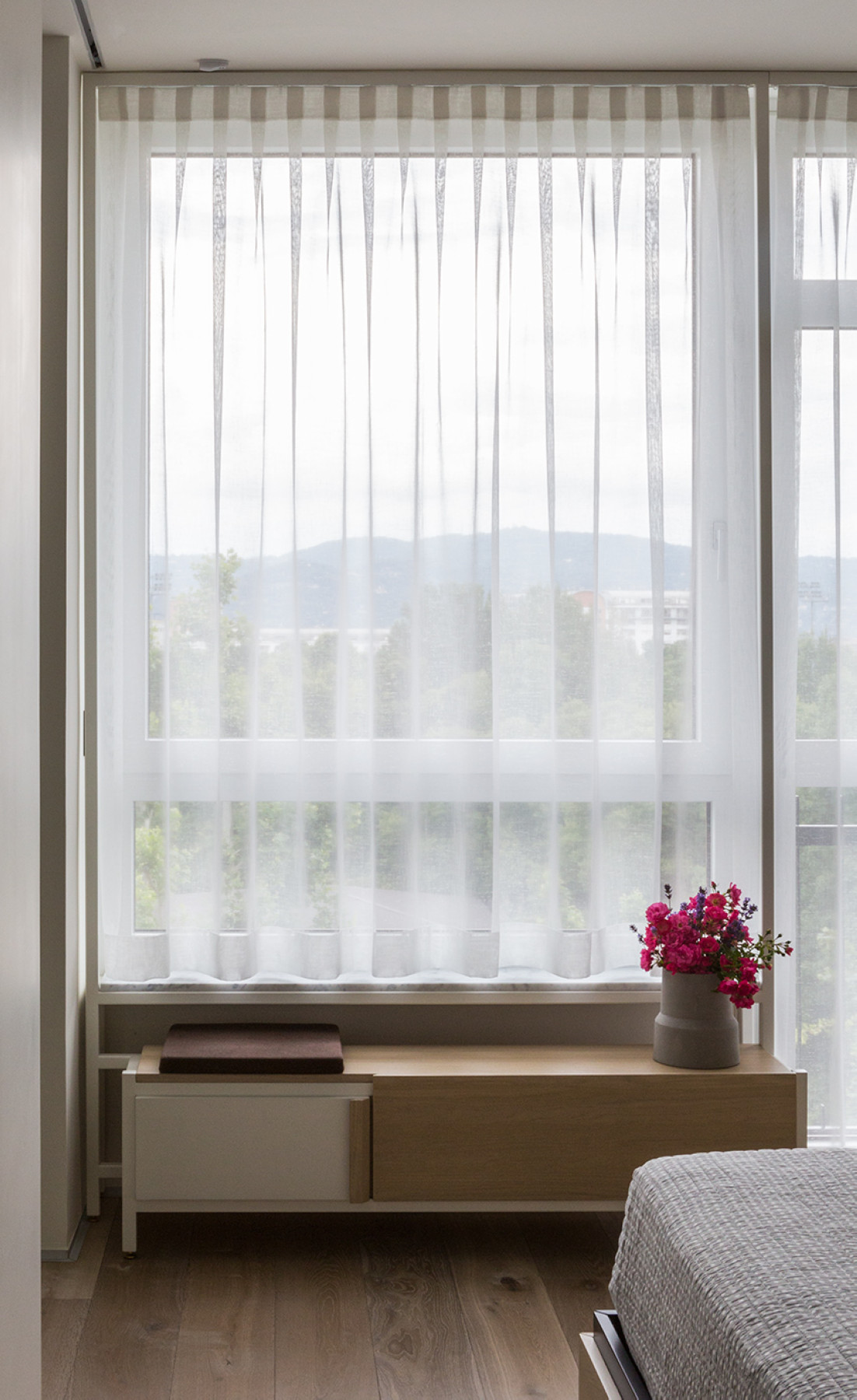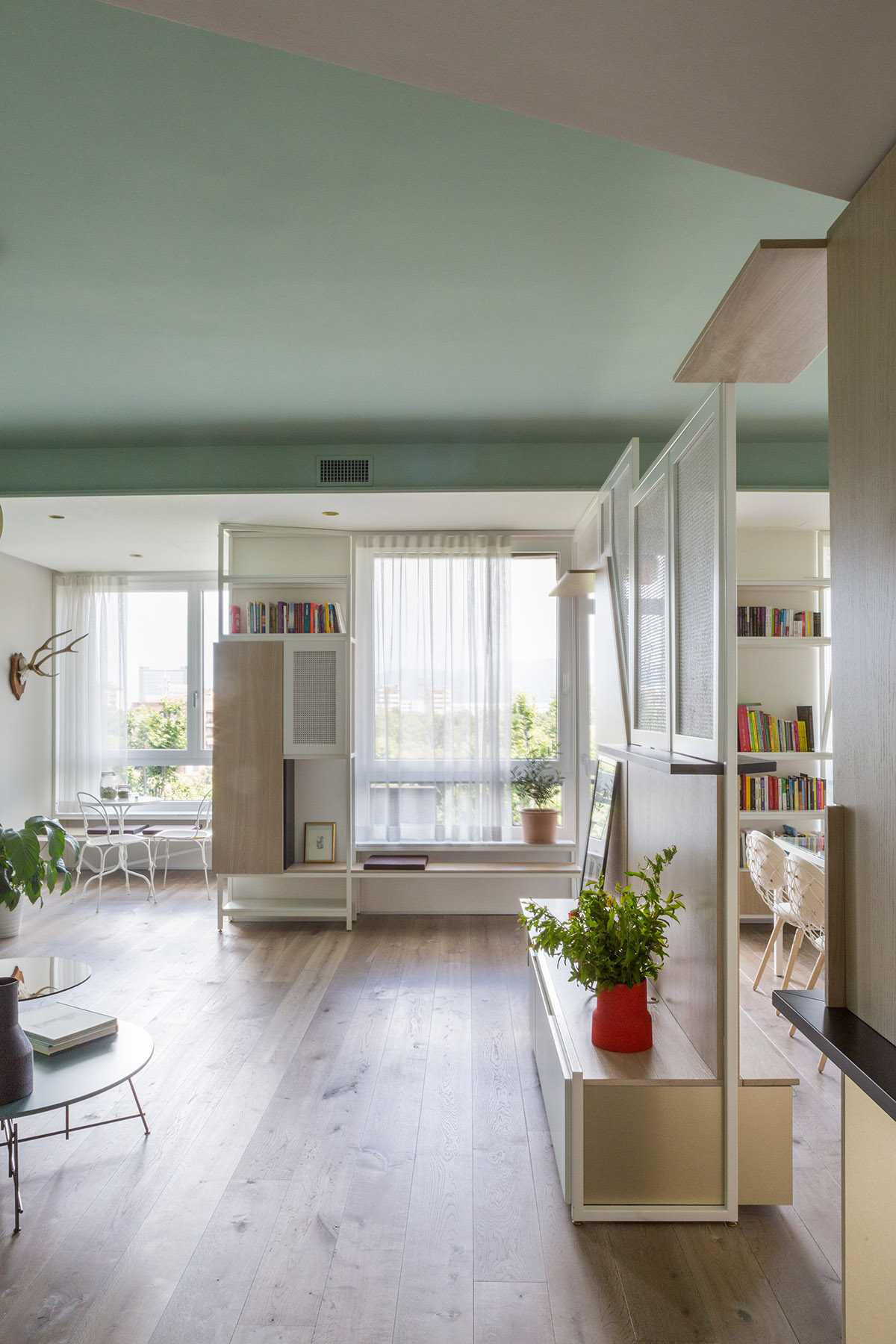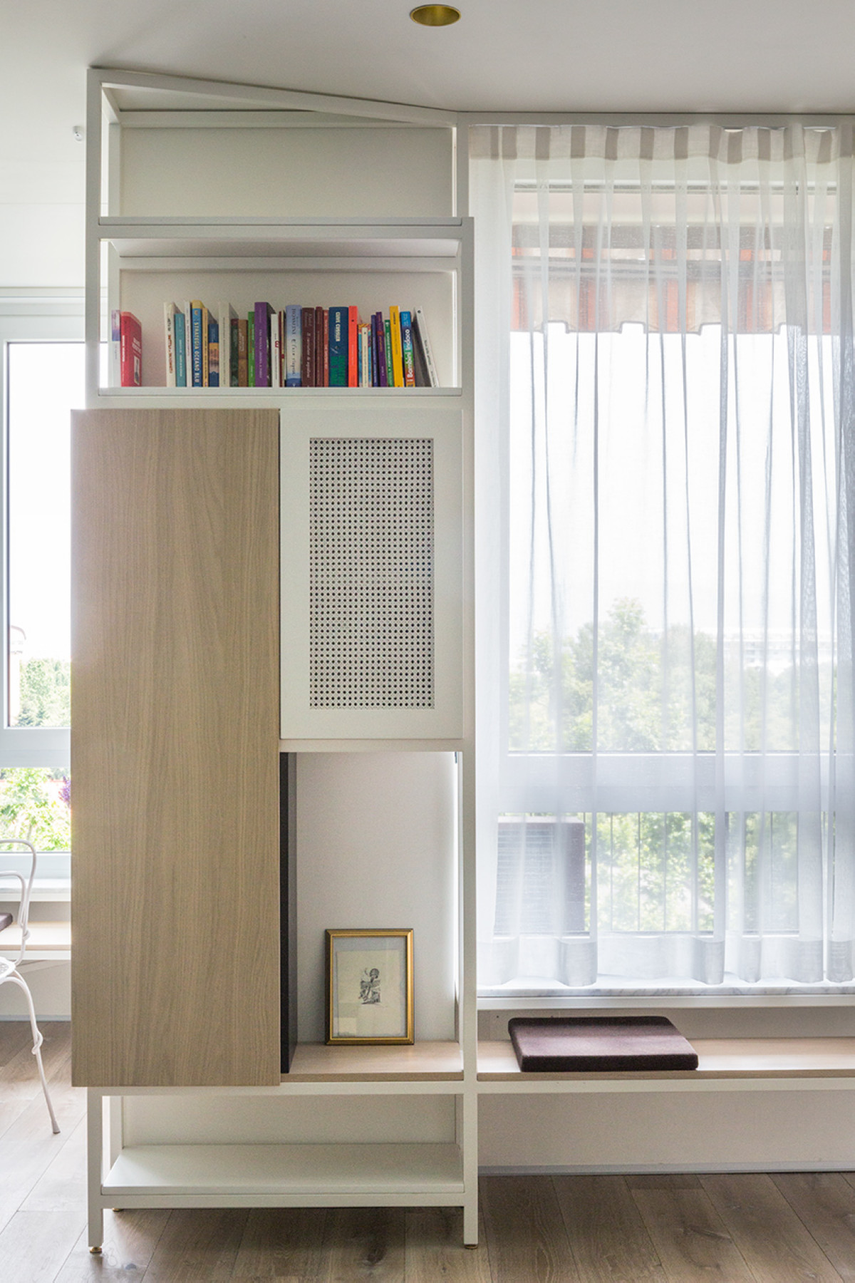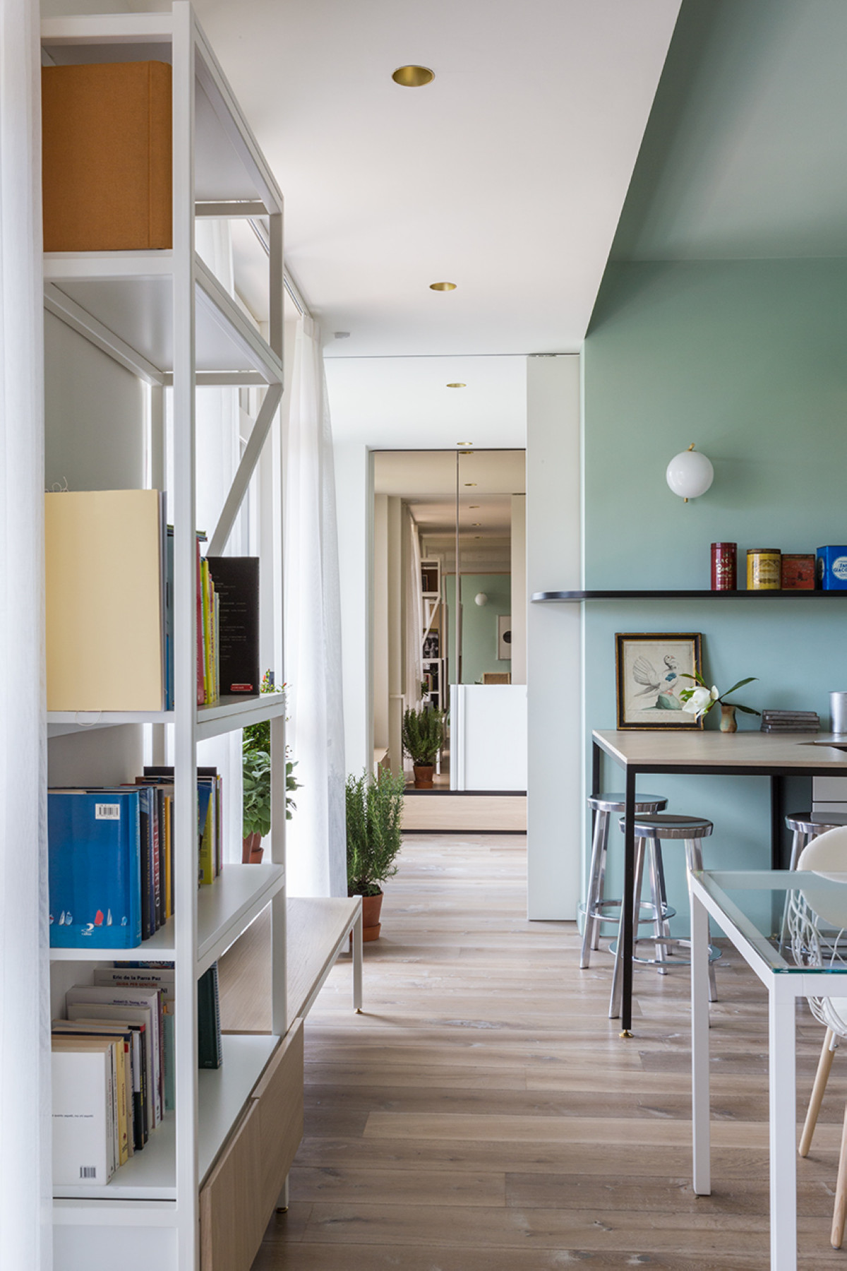 Un appartamento caratterizzato dalle grande vetrate sul parco Ruffini in corso Montecucco a Torino. Una parete che cerca di mettere in contatto la vista con la vita della casa. Una libreria-contenitore-panca-porta tende, tutta realizzata su misura, “riveste” i vetri e porta l’abitante della casa in quotidiano contatto con la finestra e con la vista. Una composizione che trova sviluppo su tutta la casa e diventa separé-mobile tv, cucina-boiserie, letto. L’uso della paglia di Vienna laccata bianca, offre leggerezza e trasparenza alla struttura, e reinterpreta la classicità e la tradizione con un uso contemporaneo.