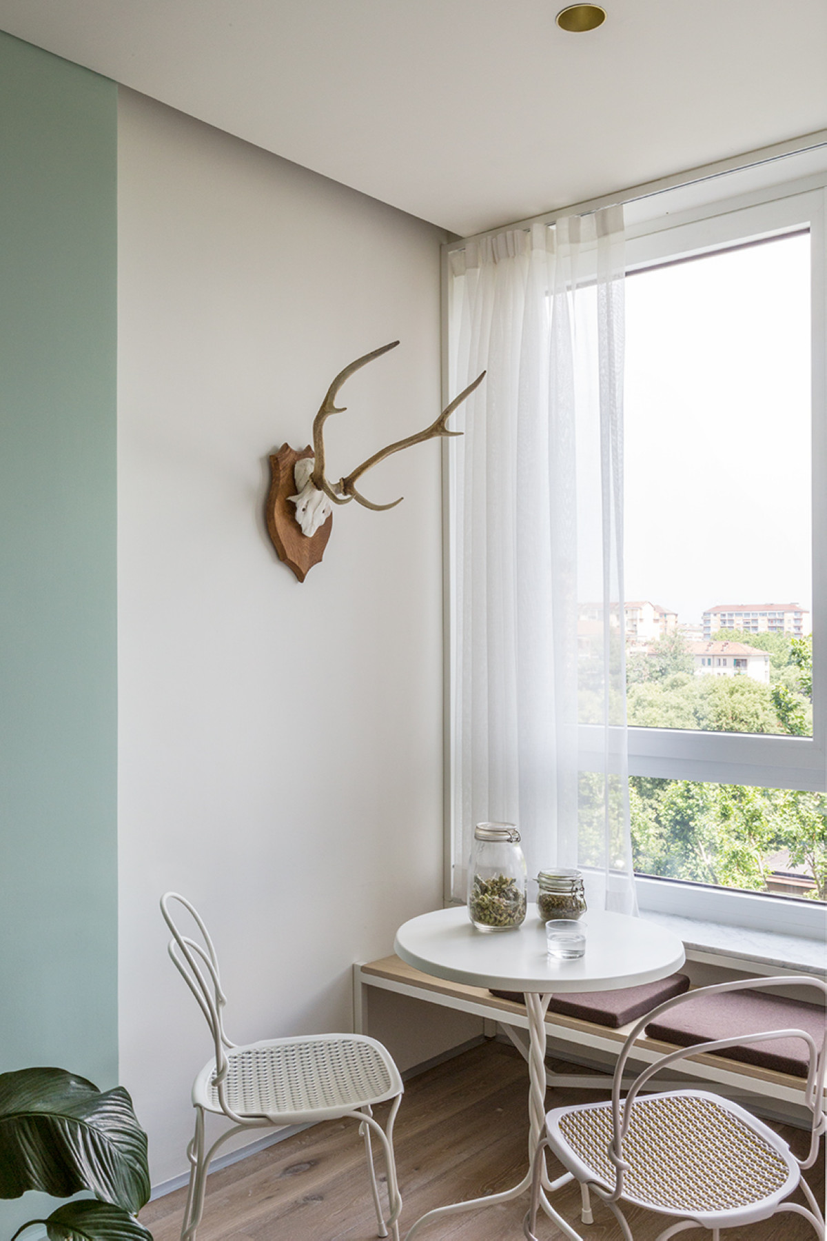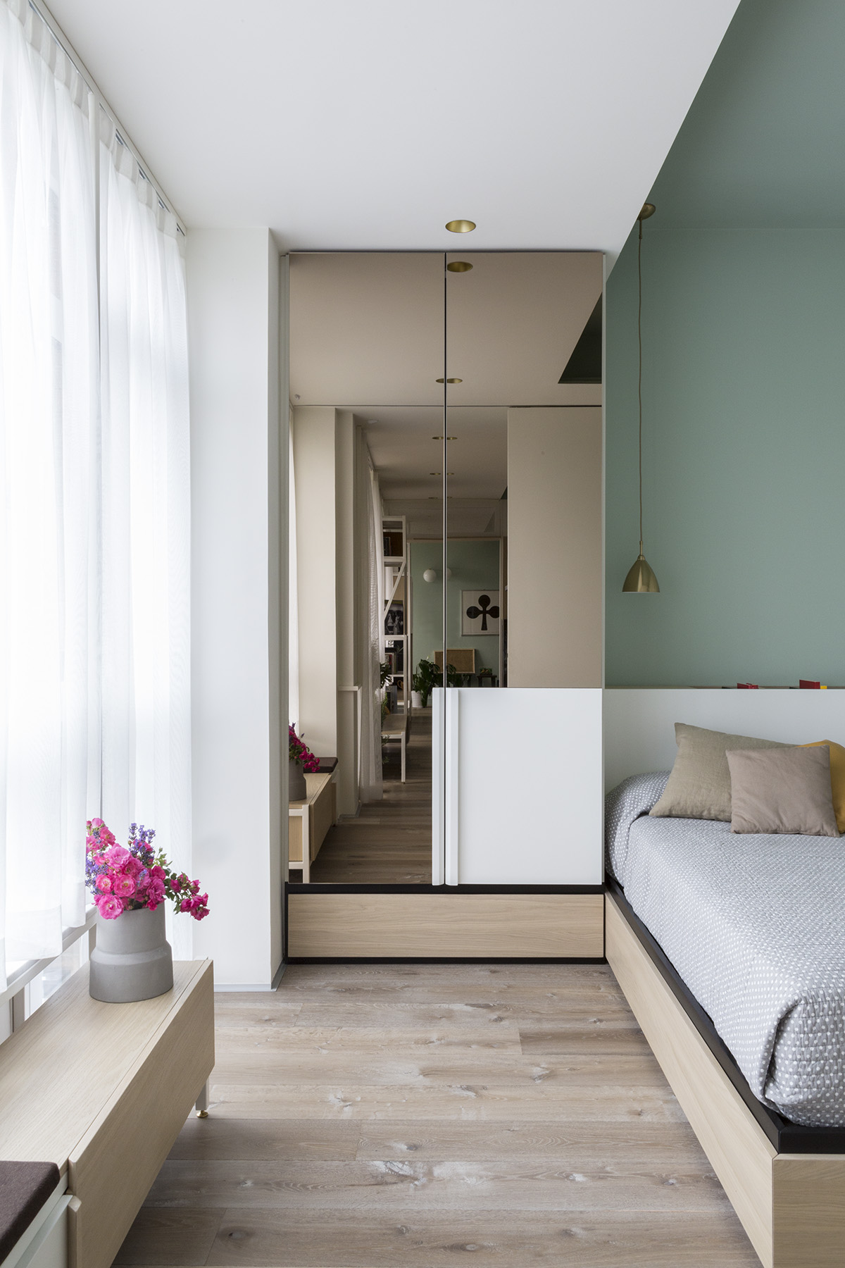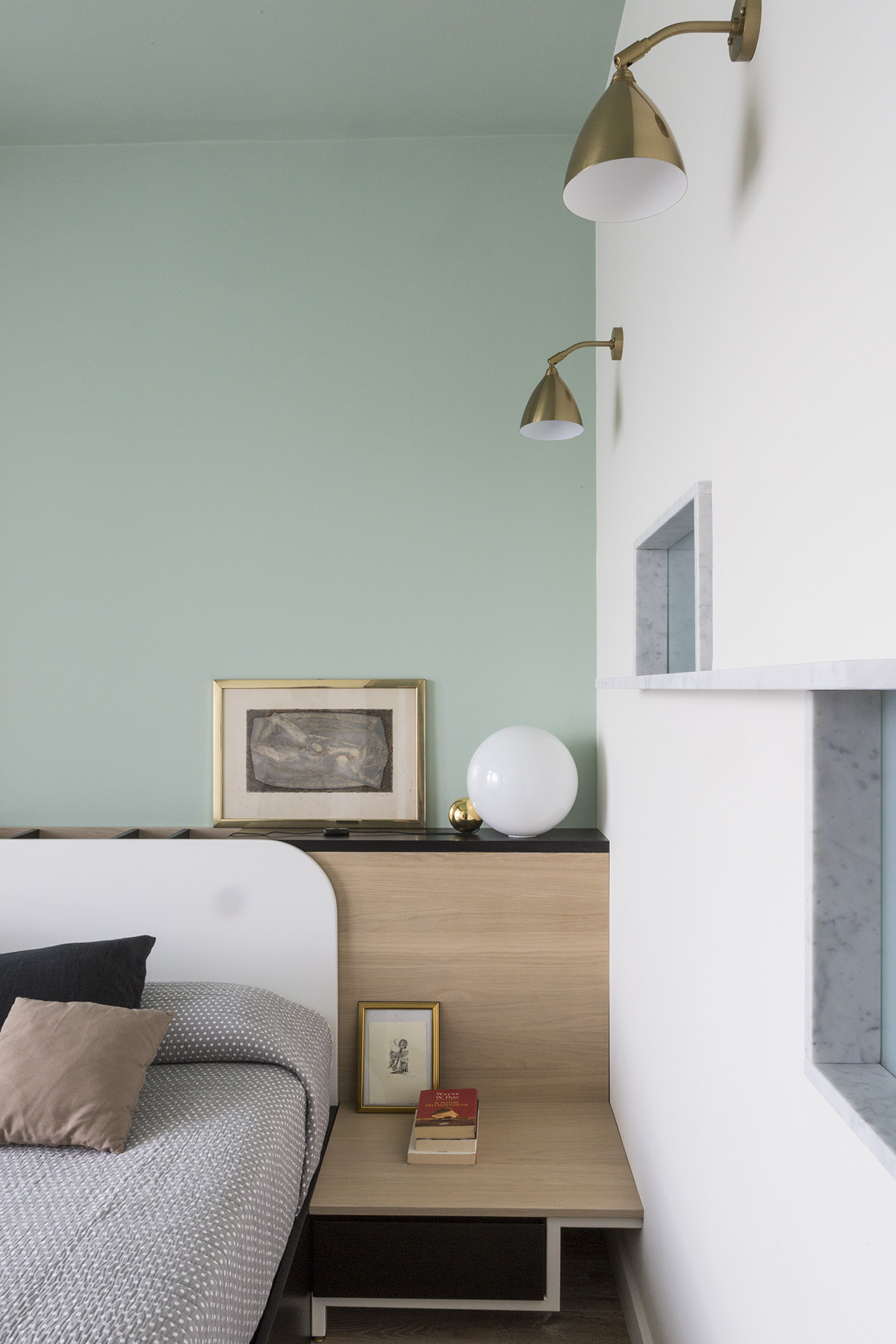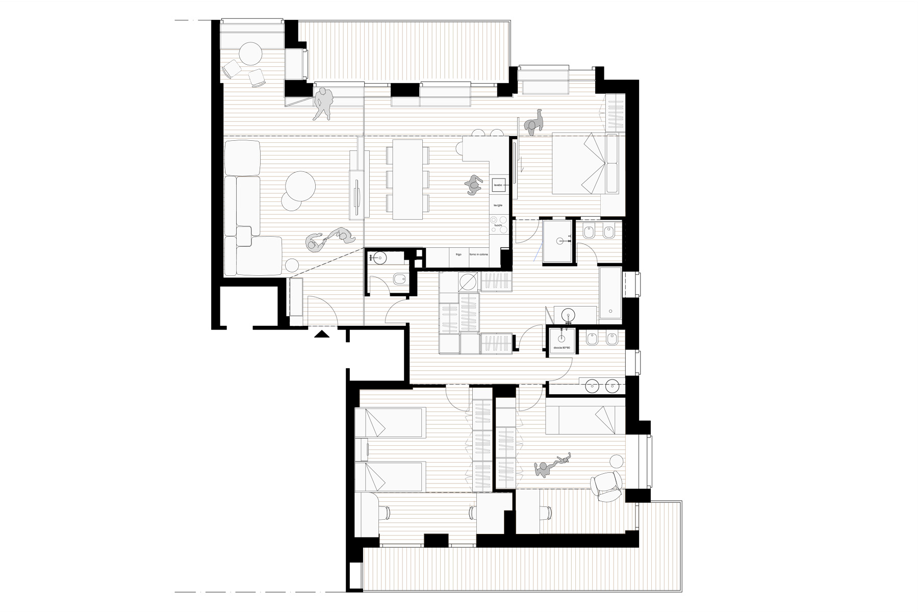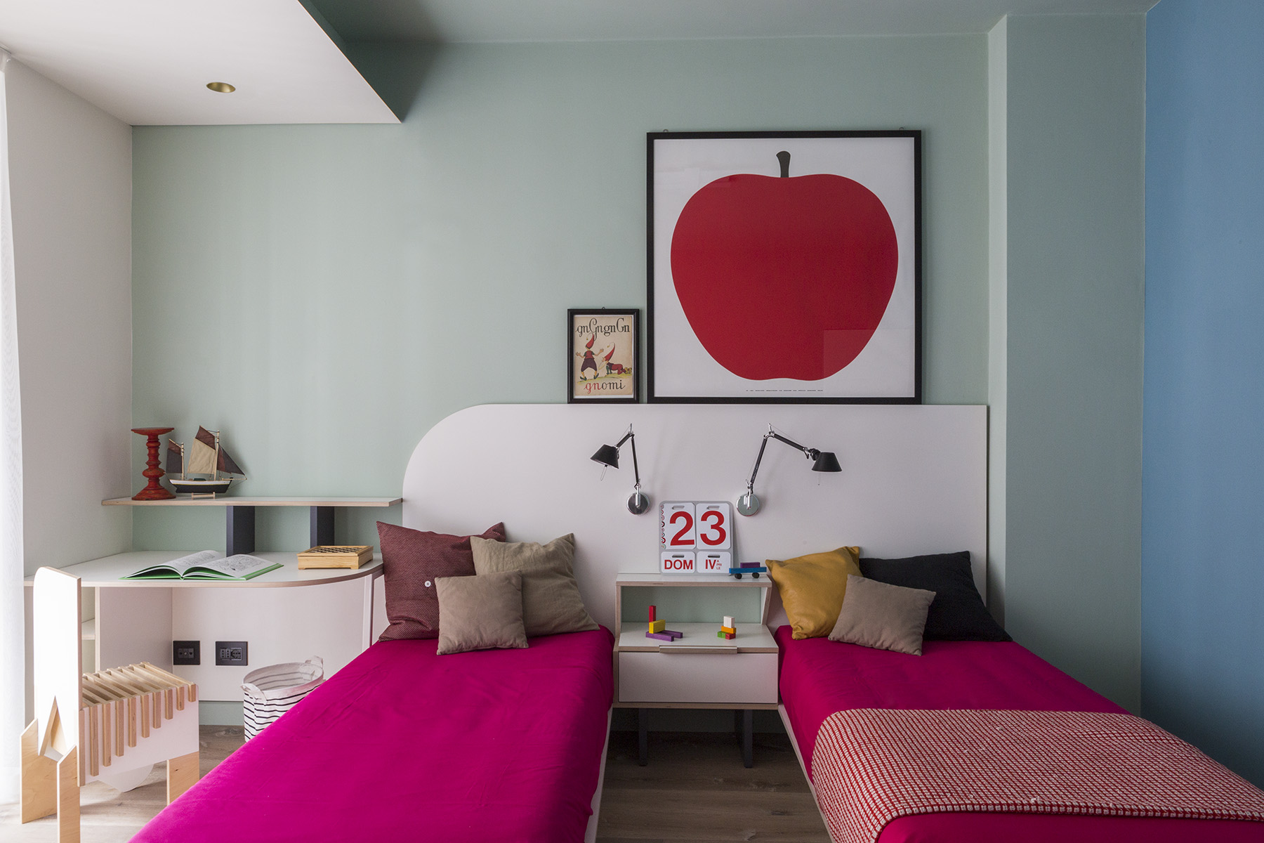 Un appartamento caratterizzato dalle grande vetrate sul parco Ruffini in corso Montecucco a Torino. Una parete che cerca di mettere in contatto la vista con la vita della casa. Una libreria-contenitore-panca-porta tende, tutta realizzata su misura, “riveste” i vetri e porta l’abitante della casa in quotidiano contatto con la finestra e con la vista. Una composizione che trova sviluppo su tutta la casa e diventa separé-mobile tv, cucina-boiserie, letto. L’uso della paglia di Vienna laccata bianca, offre leggerezza e trasparenza alla struttura, e reinterpreta la classicità e la tradizione con un uso contemporaneo.